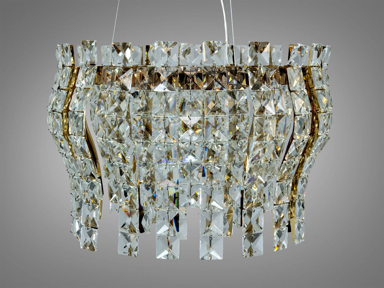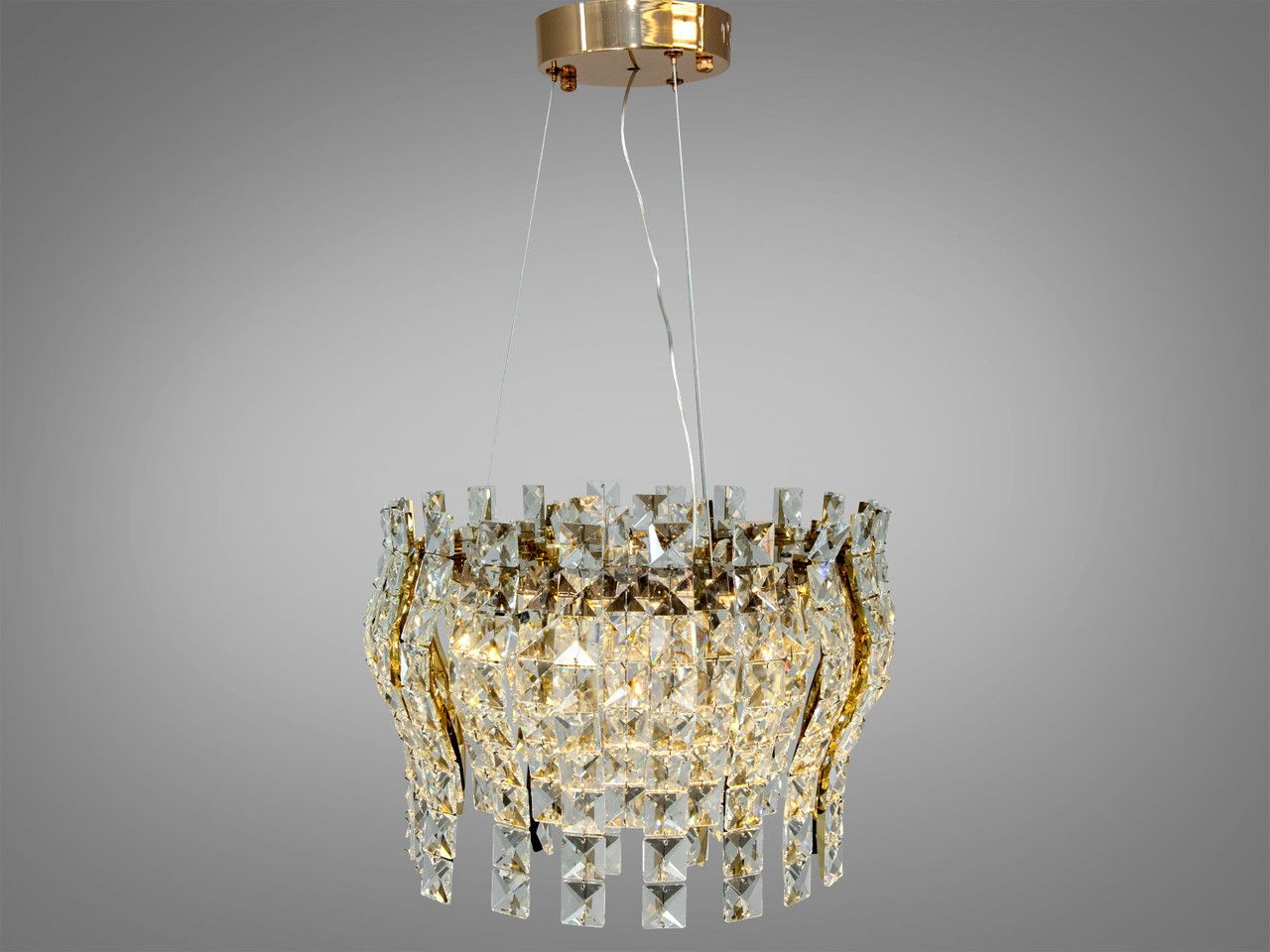 Визуальный образ люстры строится на ритмичной архитектуре вертикальных кристаллов. Металлический каркас диаметром 42 см покрыт высококачественной золотой гальваникой с безупречным зеркальным блеском. Главная особенность модели — ступенчатое расположение хрустальных призм, которые формируют зубчатый верхний край, имитируя форму королевской короны. При включении встроенных светодиодов лучи проходят сквозь грани тяжелого хрусталя (вес изделия 8 кг), создавая тысячи радужных бликов и наполняя пространство благородным мерцанием.