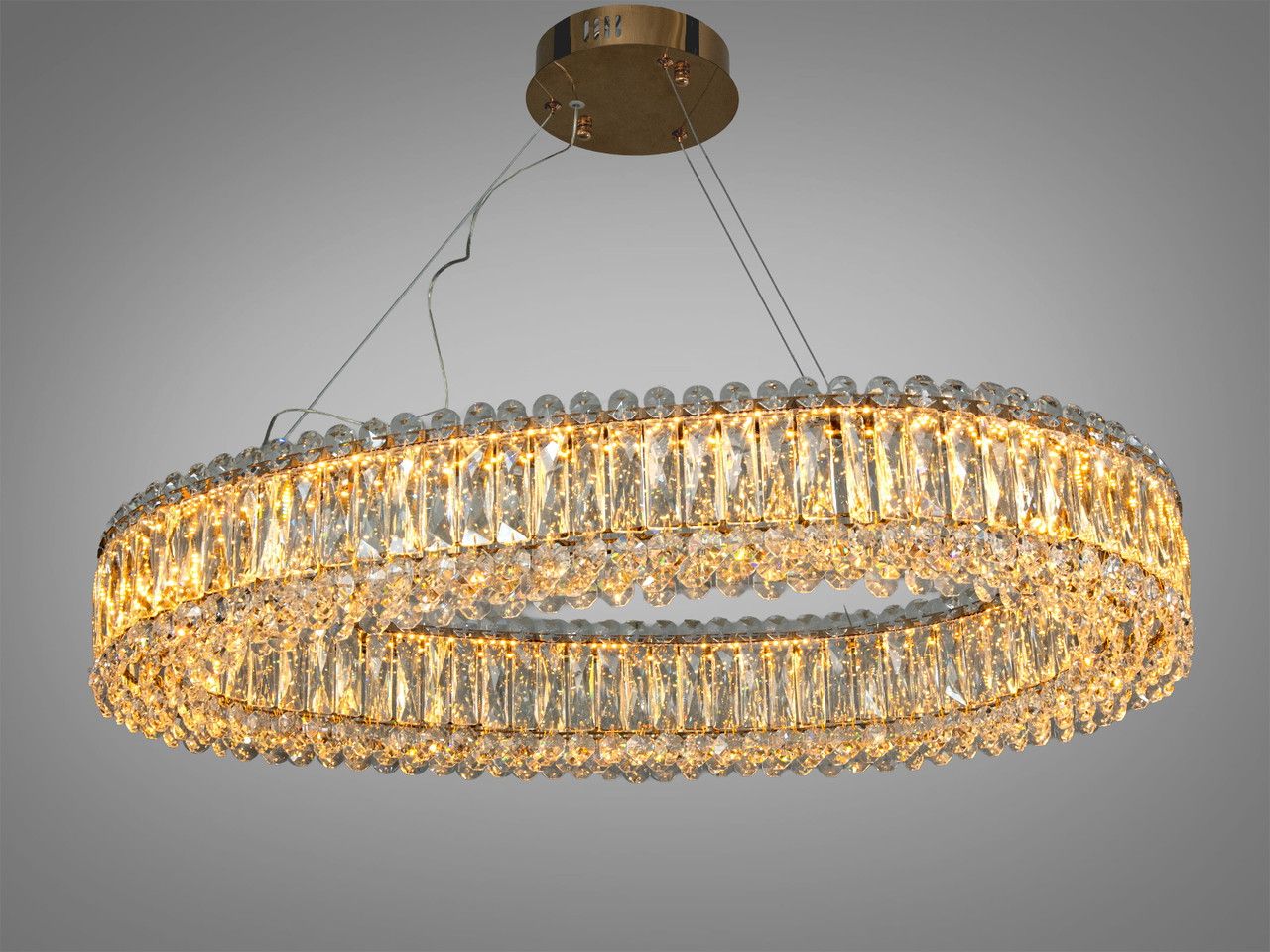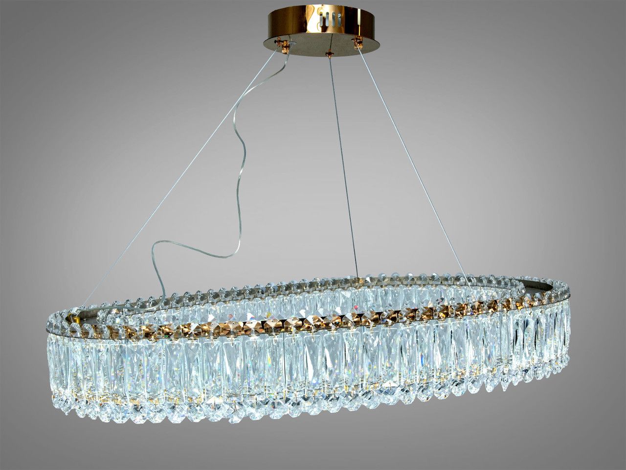 Эта статусная подвесная люстра овальной формы создана как премиальное световое решение для просторных современных интерьеров. Сочетание зеркального золотого покрытия и плотного массива хрусталя мощностью 68 Вт превращает светильник в главный арт-объект пространства, наполняя помещение ярким и многогранным светом на площади до 20 м².