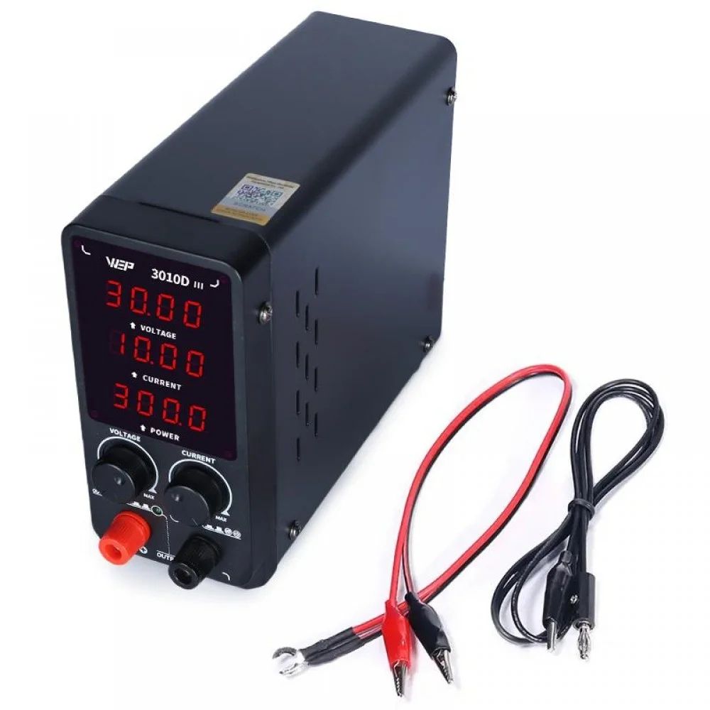 WEP 3010D-III – это высокоточный импульсный источник питания с цифровой индикацией напряжения, тока и мощности, который сочетает компактный размер, высокую мощность и надежные системы защиты. Благодаря широкому диапазону регулировки и удобному управлению устройство идеально подходит для ремонта, тестирования и обслуживания различной электроники.
