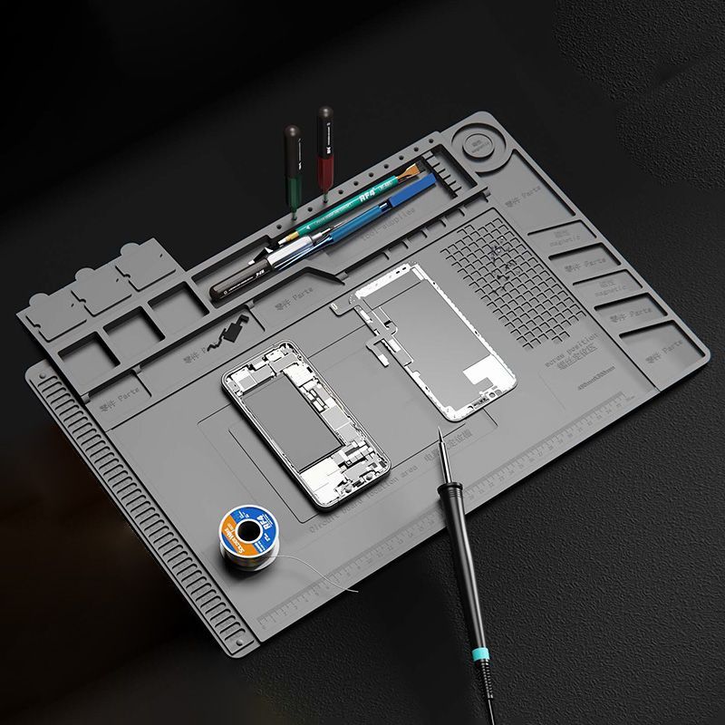 - Силиконовая основа обеспечивает отличное сцепление с рабочим столом и удерживает инструменты и компоненты на месте.