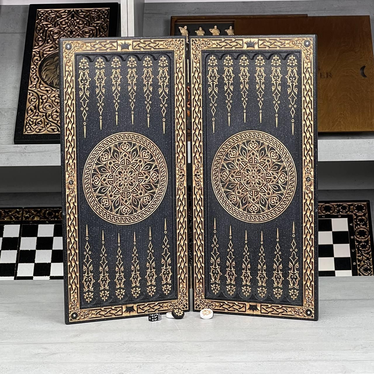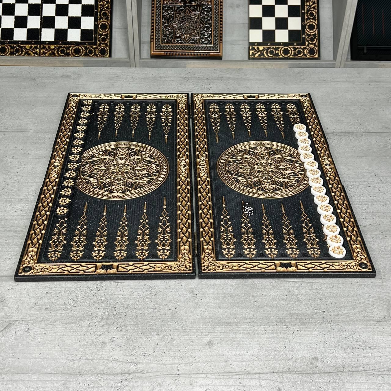 Эксклюзивные нарды из камня «Золотой Орнамент» — статусный подарок для руководящих стихиями Ищете презент, который без слов продемонстрирует ваше уважение и подчеркнет высокий авторитет будущего владельца? Эти нарды созданы для мужчин, привыкших окружать себя безупречными вещами. Тяжелый черный камень в сочетании с антикварным золотом – это выбор для рабочего кабинета топ-менеджера, бизнес-партнера или близкого человека, который ценит интеллектуальный отдых премиального уровня. Особенности этой модели делают ее безальтернативной: Монументальность и вечность. Акриловый камень – это материал, не имеющий срока годности. В отличие от дерева он не боится перепадов влажности и не рассыхается. Вес 4 кг создает ощущение реальной дорогой вещи, которую приятно держать в руках. Это инвестиция в семейную реликвию, передаваемую через поколение. Эстетика «Старого Золота». Глубокая художественная резьба наполнена премиальной краской с антикварным эффектом. Золото на черном матовом камне выглядит максимально контрастно и роскошно, подчеркивая безупречный вкус дарителя. Профессиональная эргономика. Каждая деталь игрового поля размером 500х200 мм отшлифована в идеал. Это обеспечивает плавный, тихий ход фишек – вы слышите только благородный звук камня, придающий игре особый шарм и спокойствие. Устойчивость к интенсивной игре. В отличие от лакированных изделий, акриловый камень чрезвычайно устойчив к появлению микроцарапины. Даже через 10 лет активных партий нарды будут выглядеть так же солидно, как в день покупки. Гарантированная эксклюзивность. Каждый набор финишируется мастером вручную. Вы приобретаете не массовый товар, а уникальное произведение искусства. Более того, мы можем добавить именное гравирование, чтобы сделать подарок совершенно неповторимым. Почему стоит заказать именно сейчас? Мы производим лишь ограниченное количество таких наборов в месяц из-за сложности обработки камня. Оформите заказы сегодня, и мы обеспечим отправку в день обращения в надежной упаковке. Вы оплачиваете товар только после личного осмотра на почте – мы уверены, что реальность превзойдет ваши ожидания. Технические характеристики: Параметр Значение Материал корпуса Акриловый камень (черный монолит) Оформление Антикварная золотая краска, художественная резьба Размер в сложенном виде 58 х 28 х 4 см Размер игрового поля 500 х 200 мм Вес набора 4 кг Комплектация Нарды, фи подарок те «Купить», и мы согласуем детали персонализации в течение 10 минут! Если у вас остались вопросы относительно товара, наличия, персонализации или оформления заказа, свяжитесь с нами. Телефон для заказа и консультации: Менеджеры связи и помогут выбрать нарды или шахматы для подарка или личного пользования. Адрес производства и магазина GrossMeister: Украина Львовская область г. Стрый ул. Заньковецкой, дом. 2 2-й этаж Мы осуществляем доставку нард и шахмат по всей Украине и за границу. Возможно изготовление настольных игр под заказ с индивидуальным дизайном.