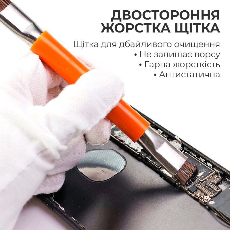 - Подходит для работы с миниатюрными компонентами, дорожками и контактами, обеспечивая аккуратное удаление пыли и остатков флюса.