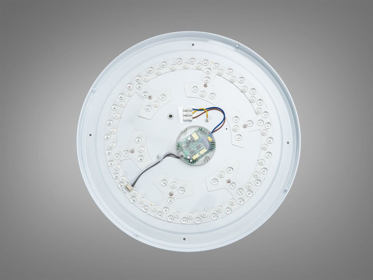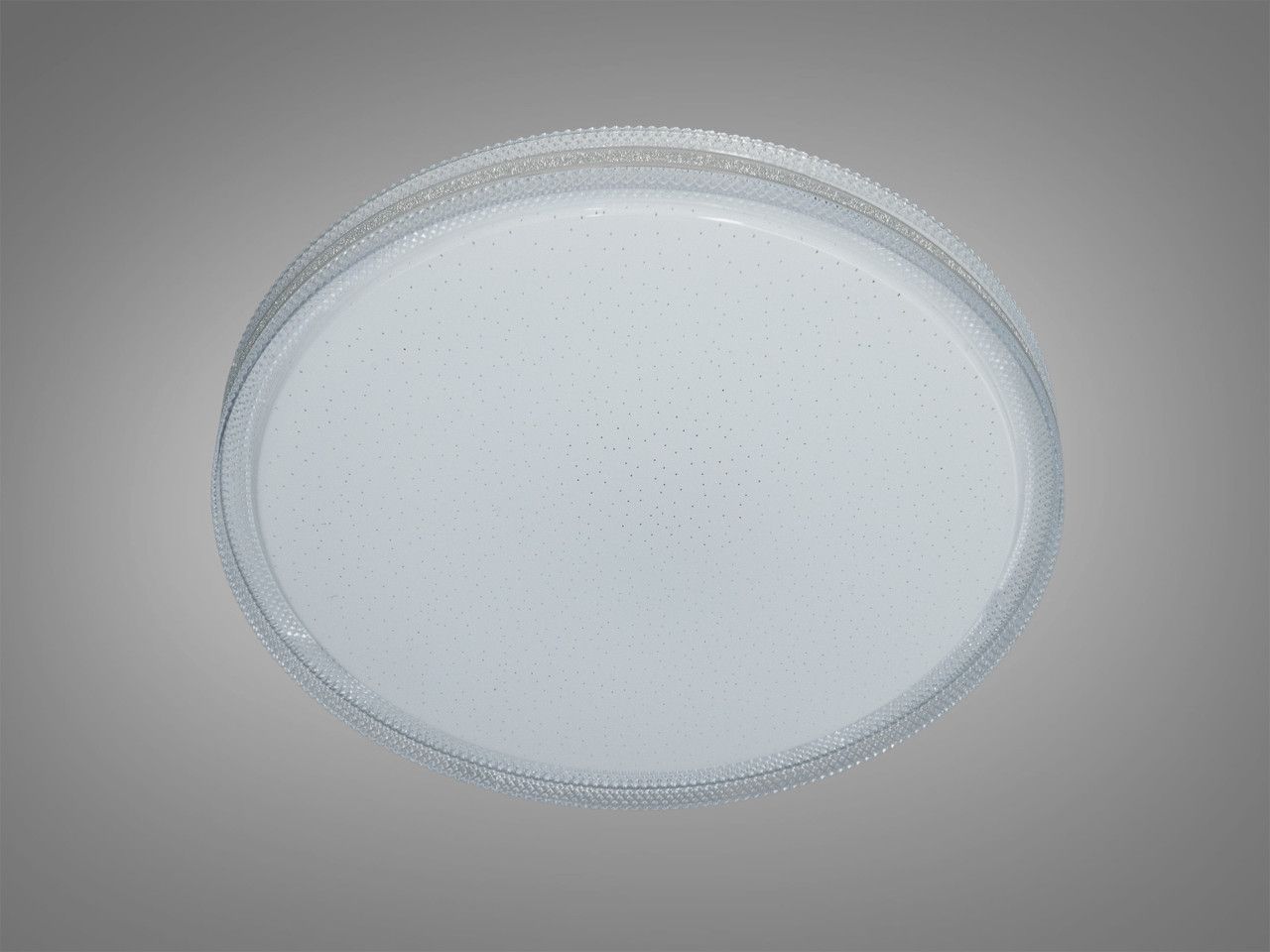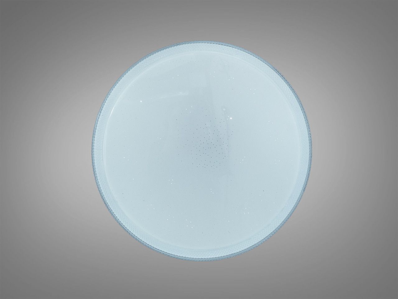 Модель выполнена в форме круглого диска диаметром 39 см. Ключевой особенностью дизайна является широкий текстурированный ободок с эффектом «кристаллических граней», который при включении преломляет лучи и создает объемные блики. Центральный плафон изготовлен из акрила с микроперфорацией («звездное небо»), обеспечивающей мягкое мерцание. Белый матовый корпус визуально сливается с потолком, делая конструкцию легкой и технологичной.