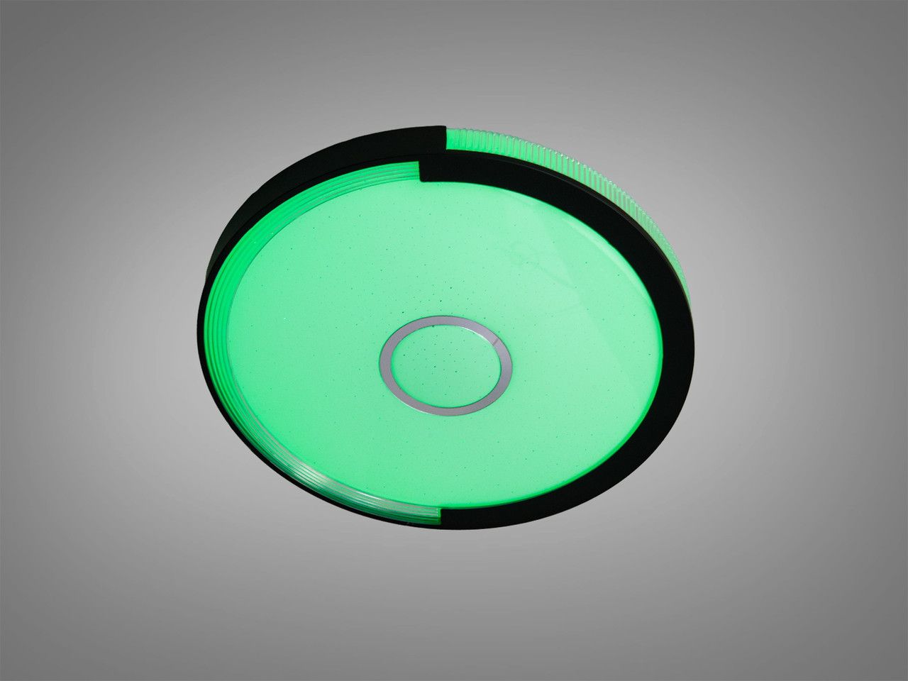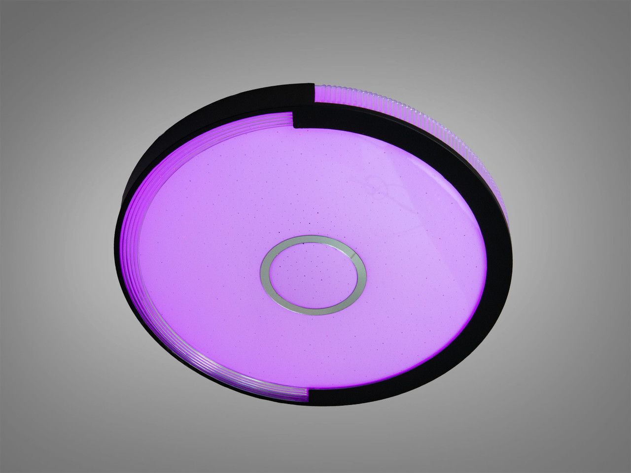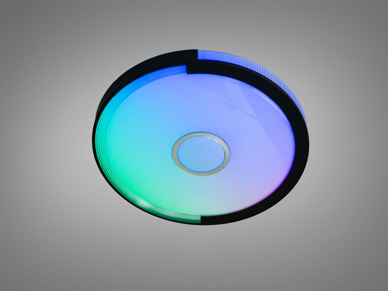 Модель выполнена в форме диска диаметром 39 см с контрастным черным матовым ободком, который придает конструкции графичность. Плафон изготовлен из высококачественного акрила с микроперфорацией: при включении создается эффект тысяч мерцающих звезд. Боковая часть имеет вертикальную текстуру, которая преломляет RGB-свет, создавая насыщенный цветовой ореол вокруг прибора.