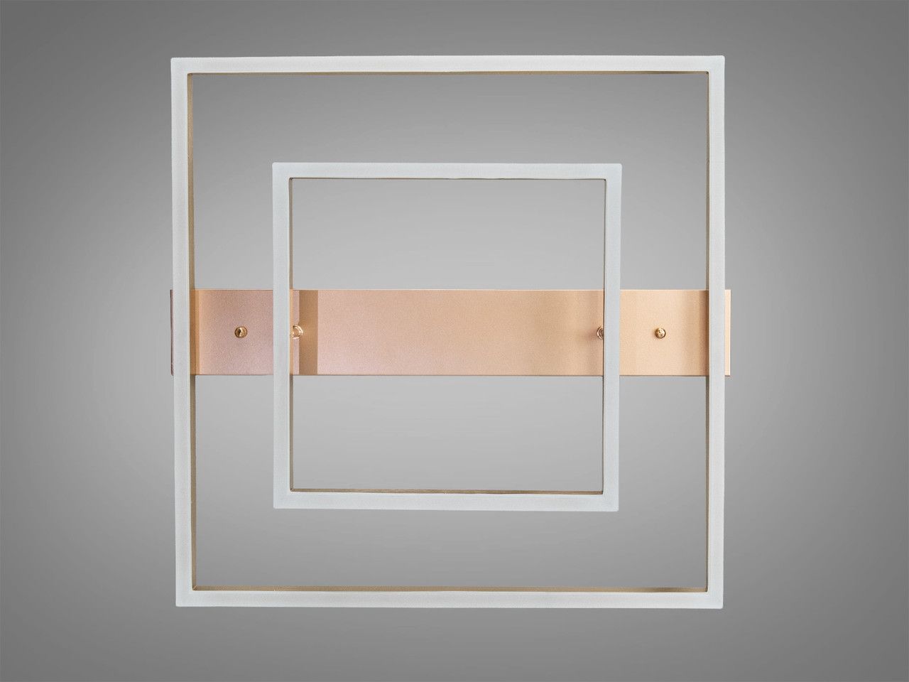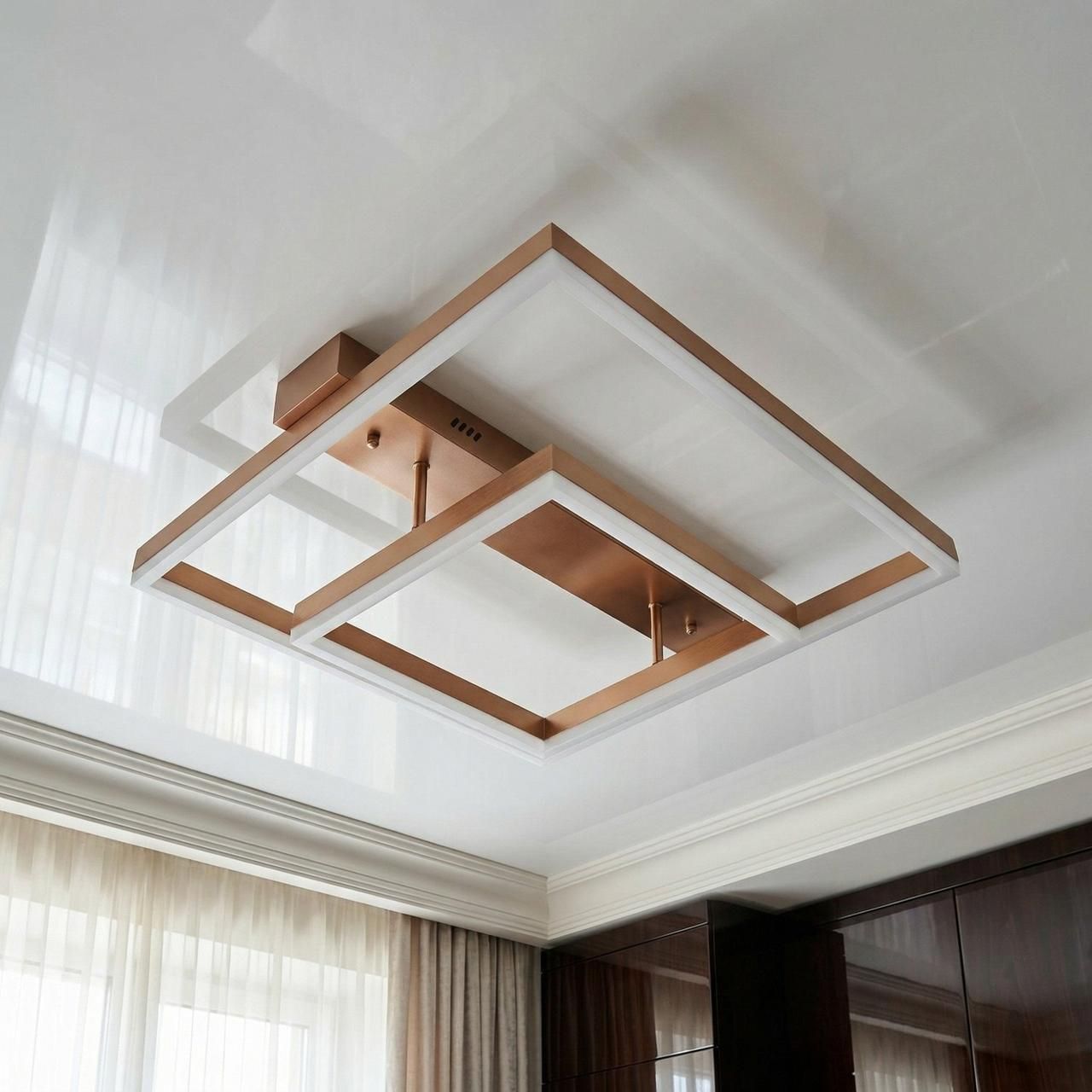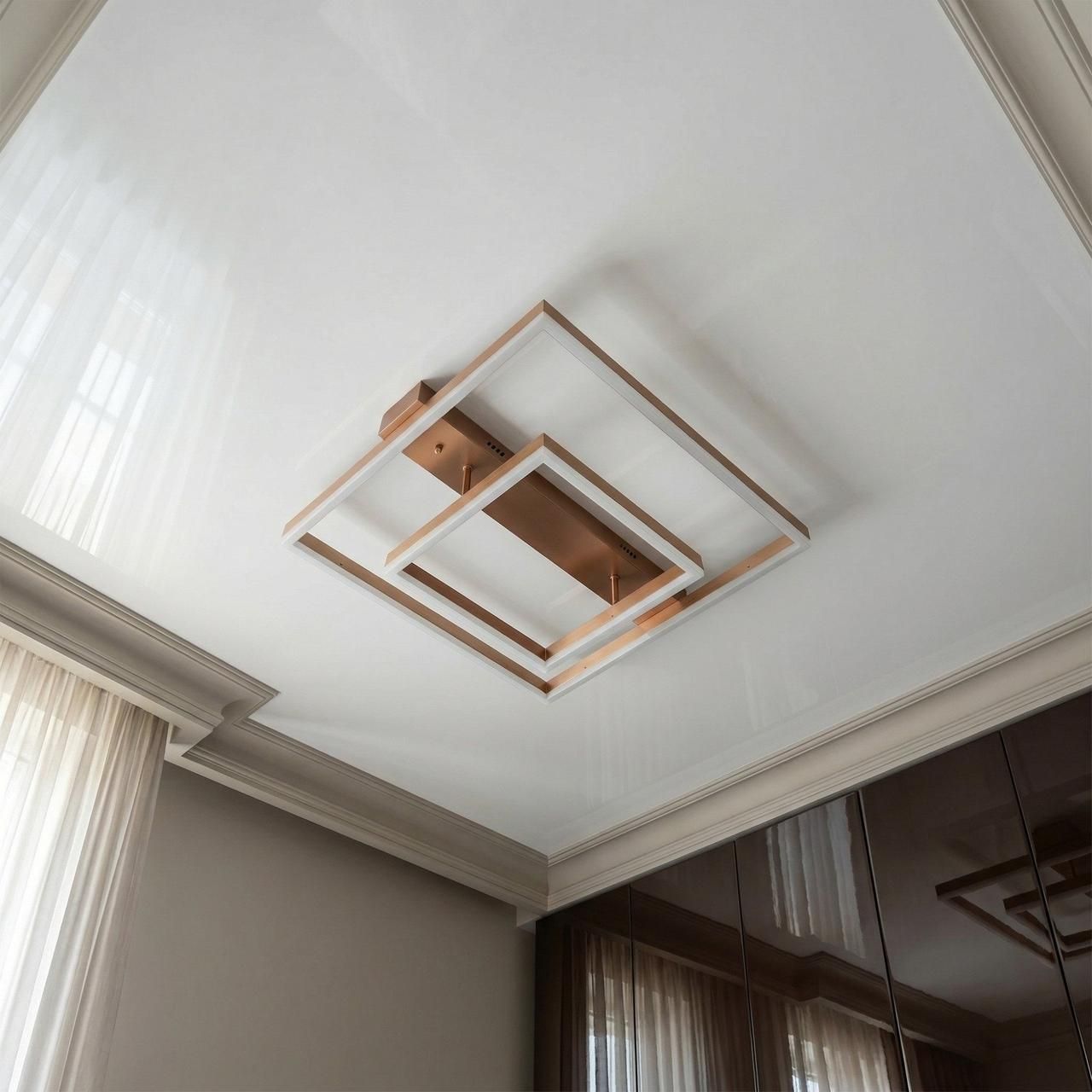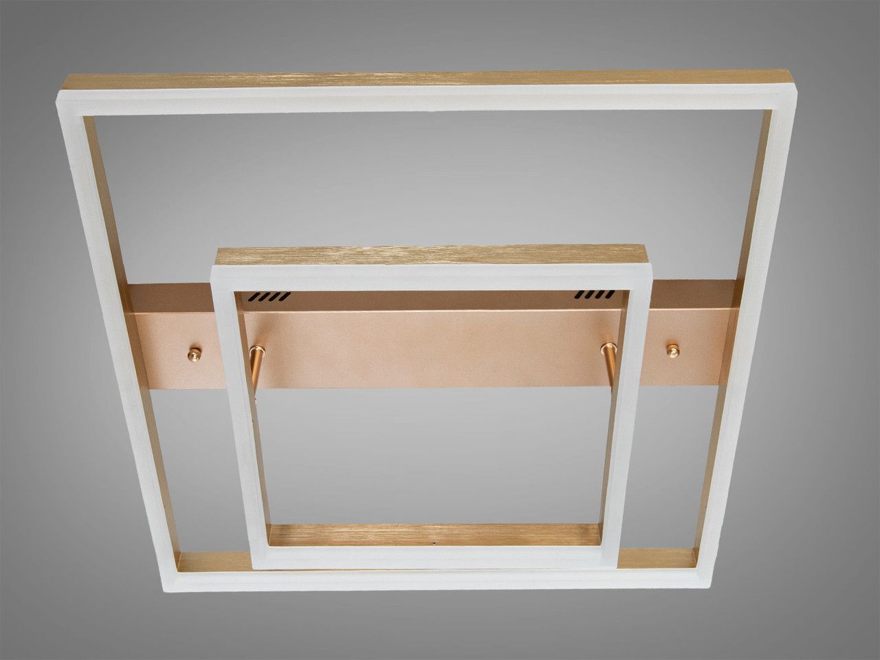 Модель выполнена в стиле геометрического минимализма с акцентом на премиальные материалы. Конструкция состоит из двух световых квадратов разного размера, вложенных один в другой, что создает эффект объемной светящейся рамы. Корпус изготовлен из металла с качественным гальваническим покрытием «золото», обеспечивающим безупречный зеркальный блеск. Рассеиватели из высококачественного акрила обеспечивают равномерную заливку светом без резких теней.