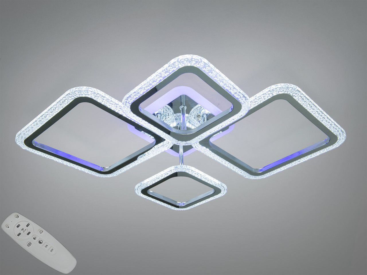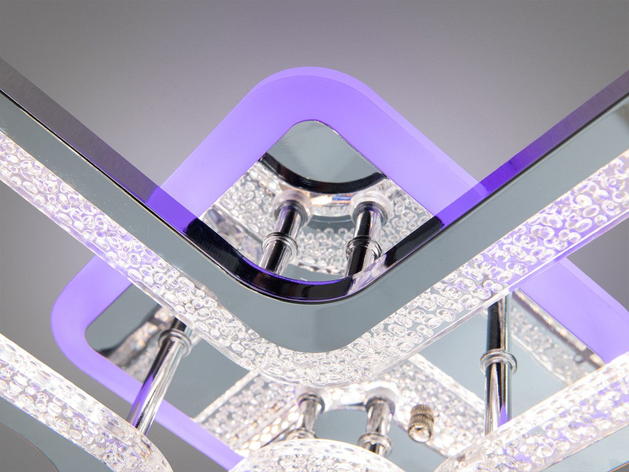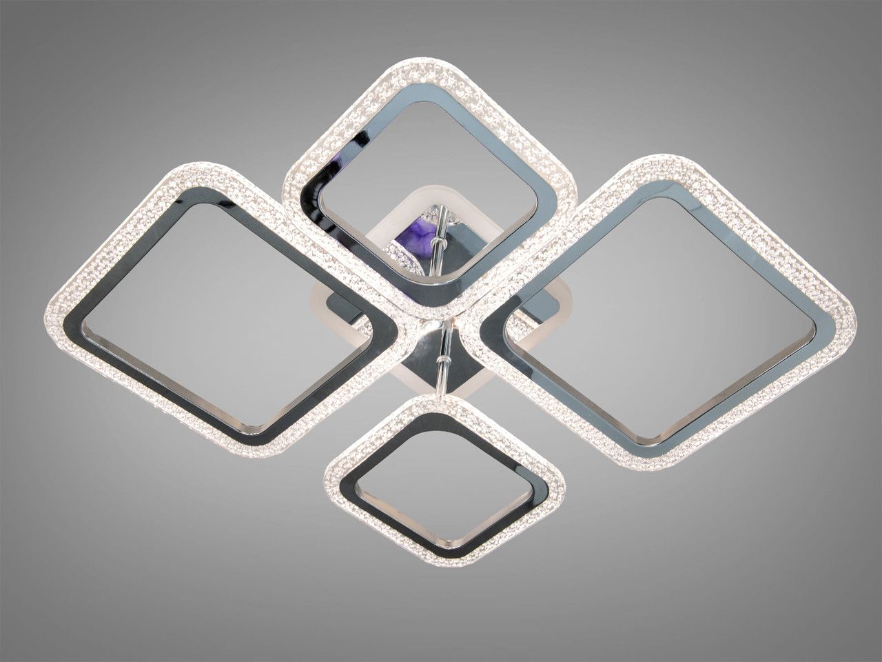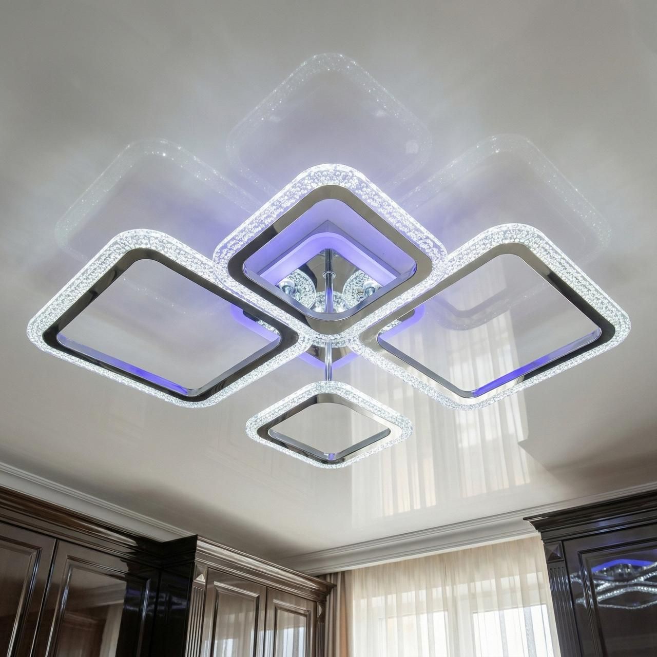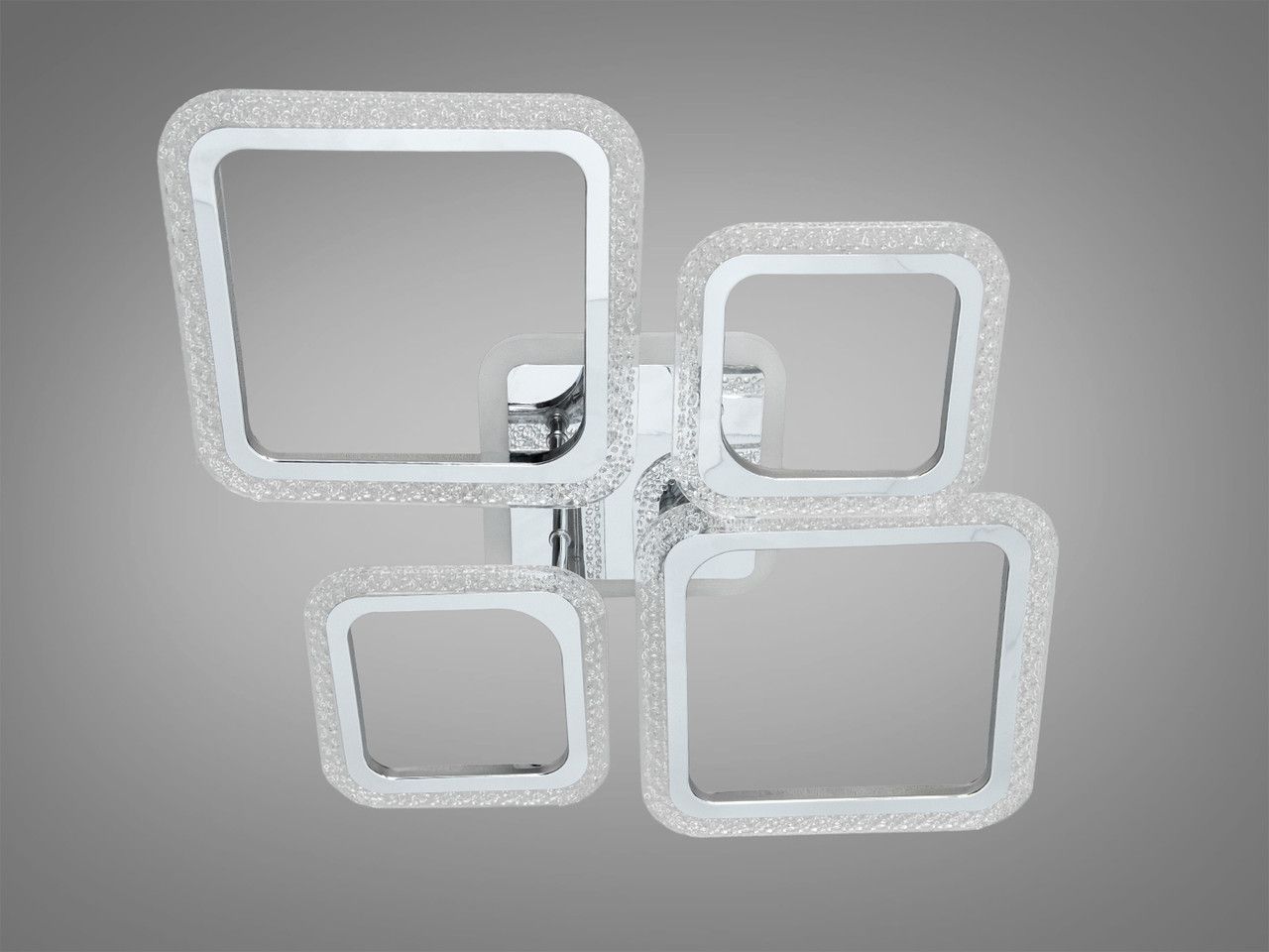 Модель выполнена в стиле геометрического минимализма: композиция из четырех квадратных рамок разного размера создает динамичный и современный силуэт. Корпус изготовлен из металла с качественным гальваническим покрытием «хром», обеспечивающим безупречный зеркальный блеск. Боковые грани дополнены вставками из акрила с фактурой «хрустальная крошка», которые преломляют лучи и создают красивую игру бликов. Встроенная подсветка основания («halo effect») подсвечивает потолок вокруг люстры, добавляя визуальный объем.