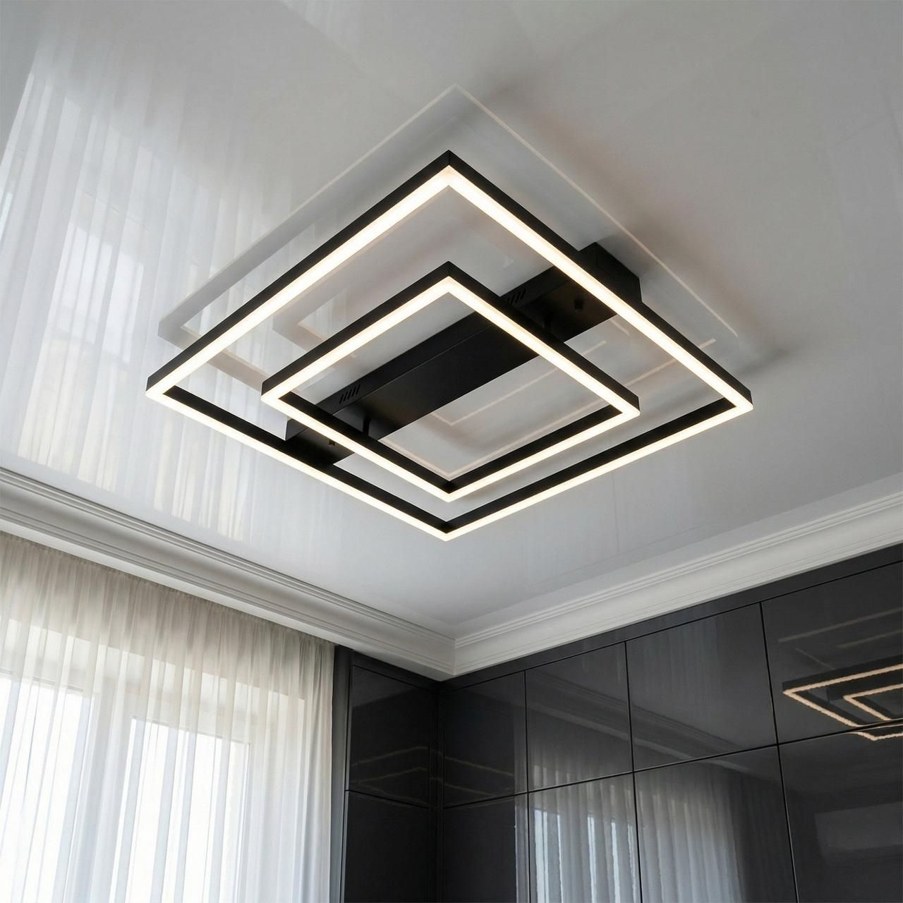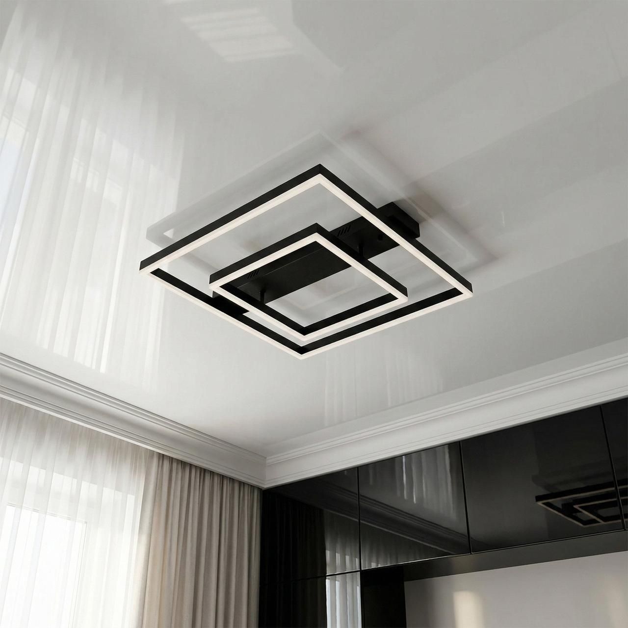 Модель выполнена в стиле геометрического минимализма. Конструкция состоит из двух световых квадратов разного размера, вложенных один в другой, что создает эффект объемной световой рамки. Корпус изготовлен из металла с качественным черным матовым покрытием, а рассеиватели — из высококачественного акрила. Черный цвет корпуса создает графичный контраст с поверхностью потолка, подчеркивая строгую эстетику современного пространства.