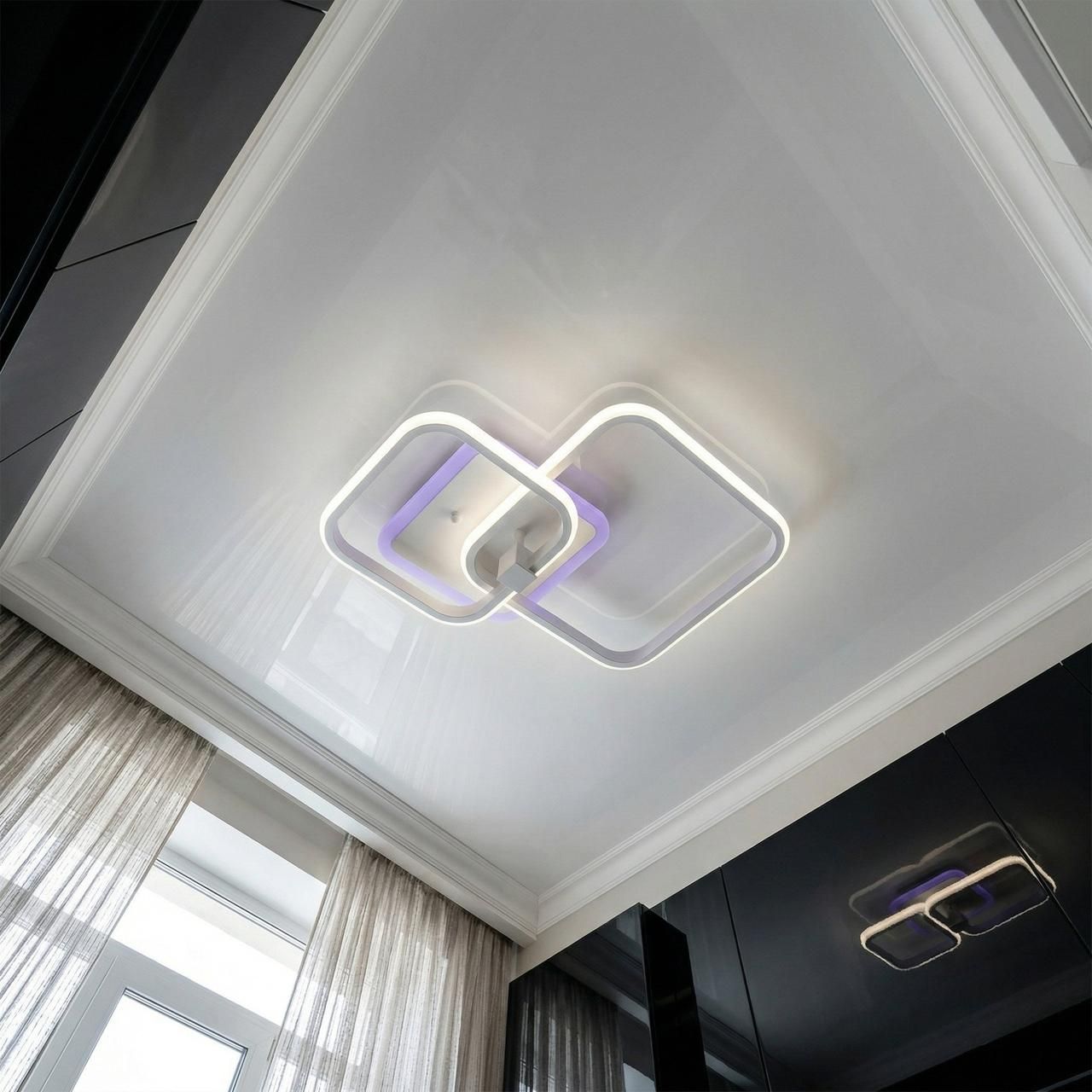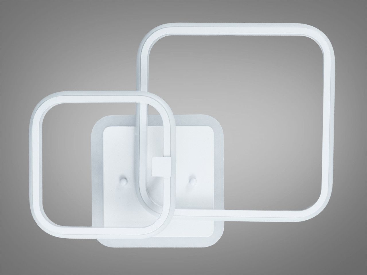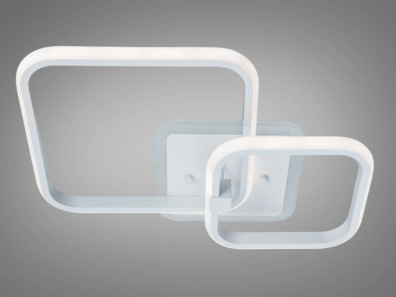 Модель выполнена в стиле современного геометрического минимализма. Конструкция состоит из двух переплетенных квадратов со скругленными углами, что создает динамичный и легкий силуэт. Корпус изготовлен из металла с качественным белым порошковым покрытием, которое визуально «растворяет» прибор на фоне потолка. Рассеиватели из высококачественного акрила обеспечивают равномерную заливку светом. Изюминка модели — встроенная подсветка основания («halo effect»), создающая мягкий цветной ореол на потолке.