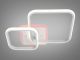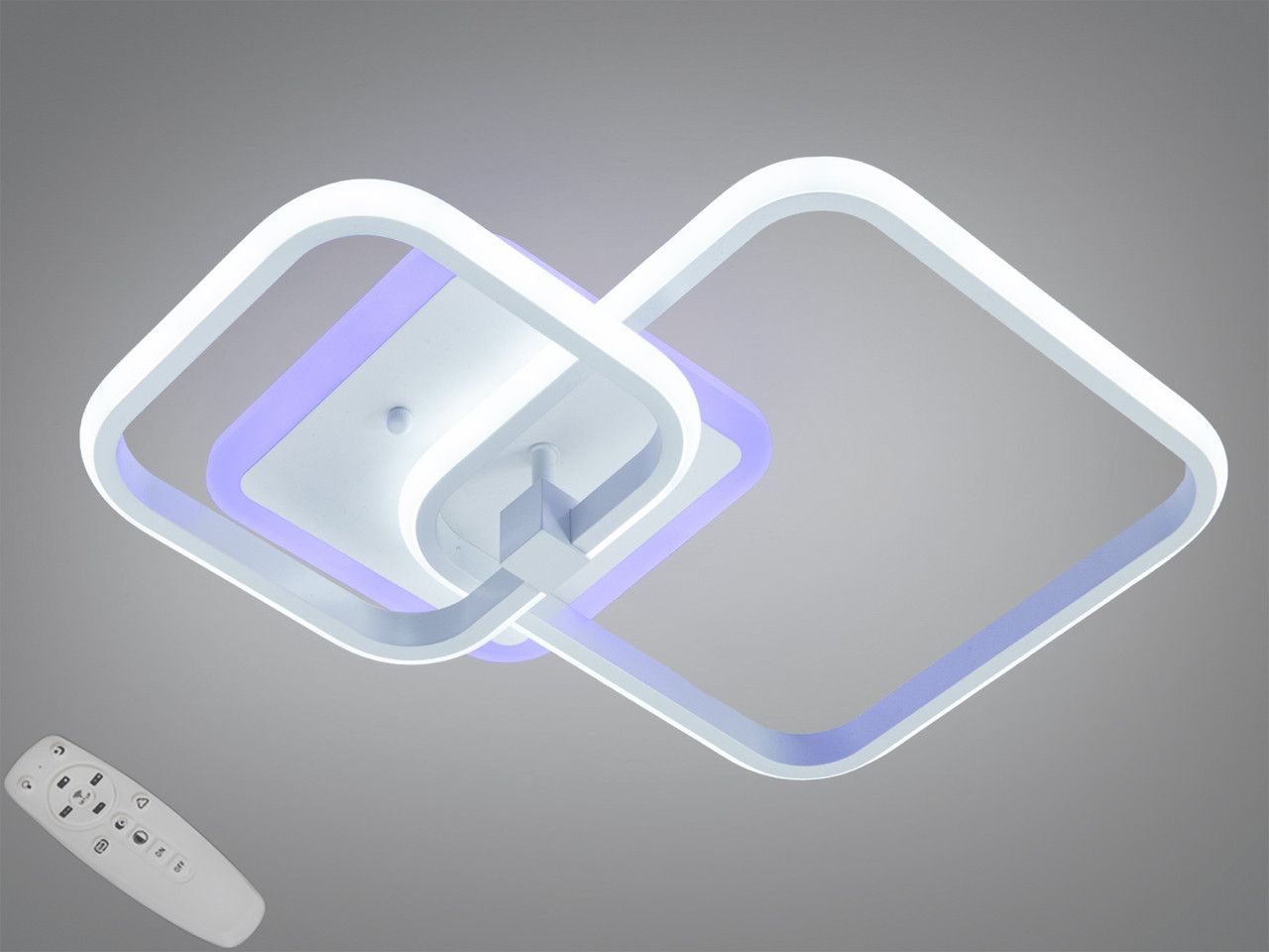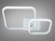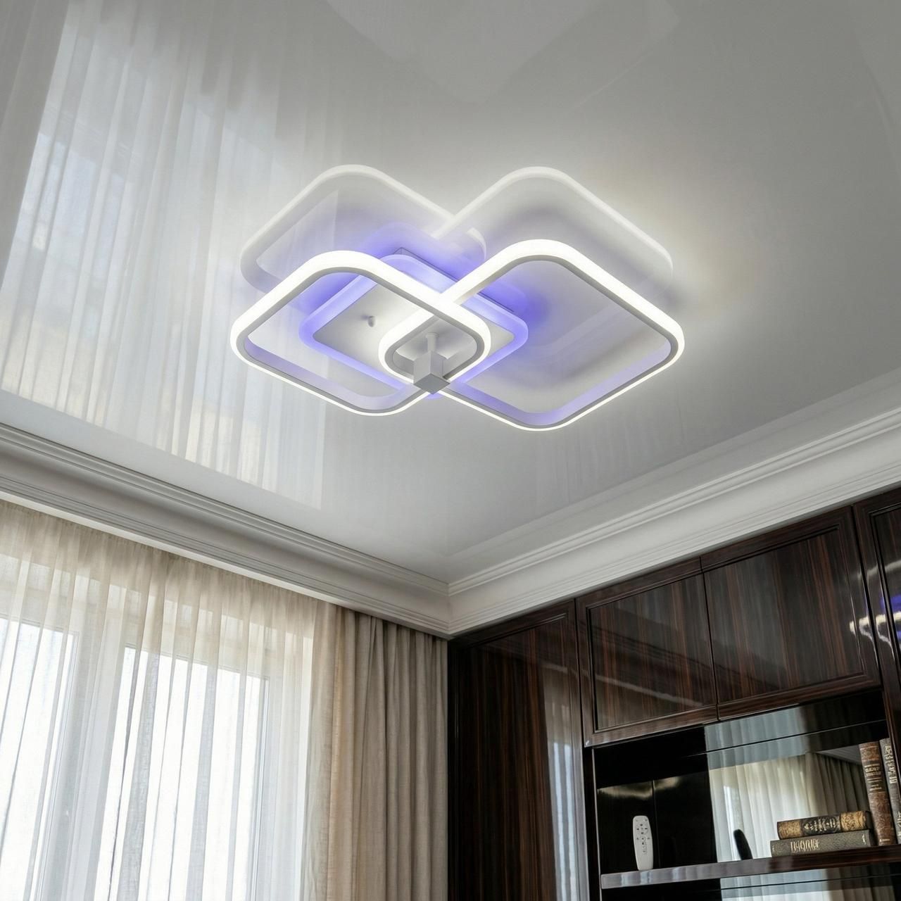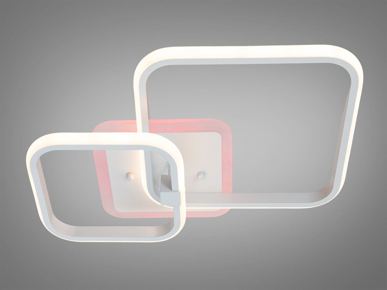 Модель выполнена в стиле современного геометрического минимализма. Конструкция состоит из двух переплетенных квадратов со скругленными углами, что создает динамичный и легкий силуэт. Корпус изготовлен из металла с качественным белым порошковым покрытием, которое визуально «растворяет» прибор на фоне потолка. Рассеиватели из высококачественного акрила обеспечивают равномерную заливку светом. Изюминка модели — встроенная подсветка основания («halo effect»), создающая мягкий цветной ореол на потолке.