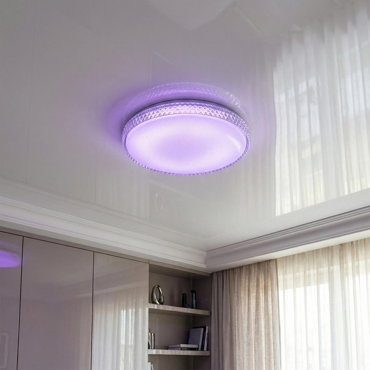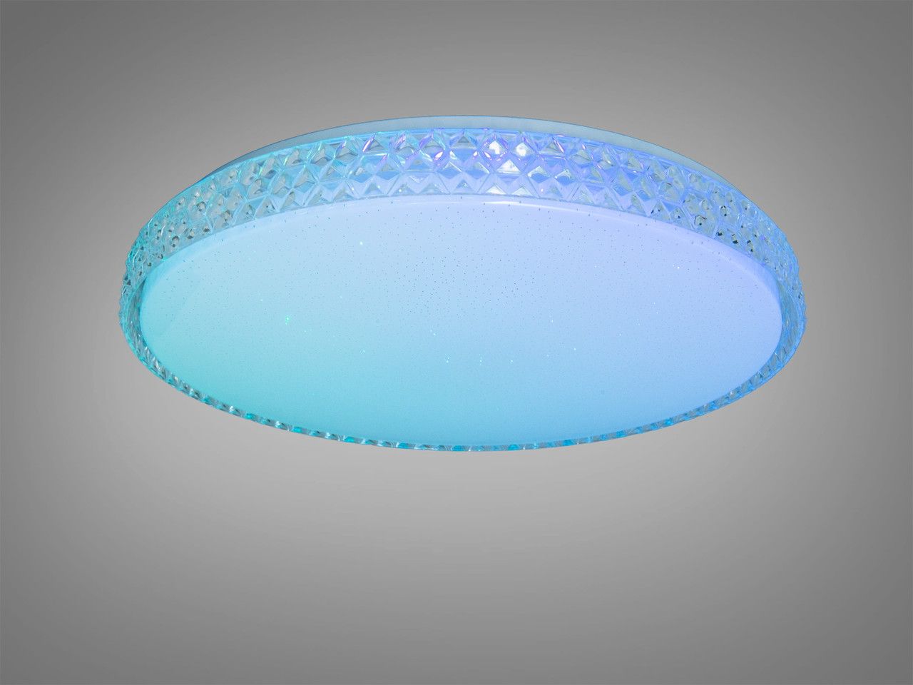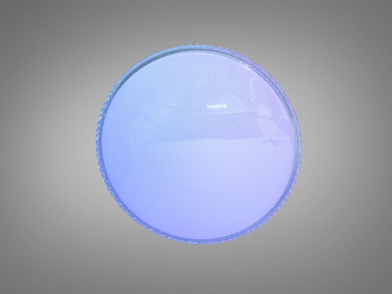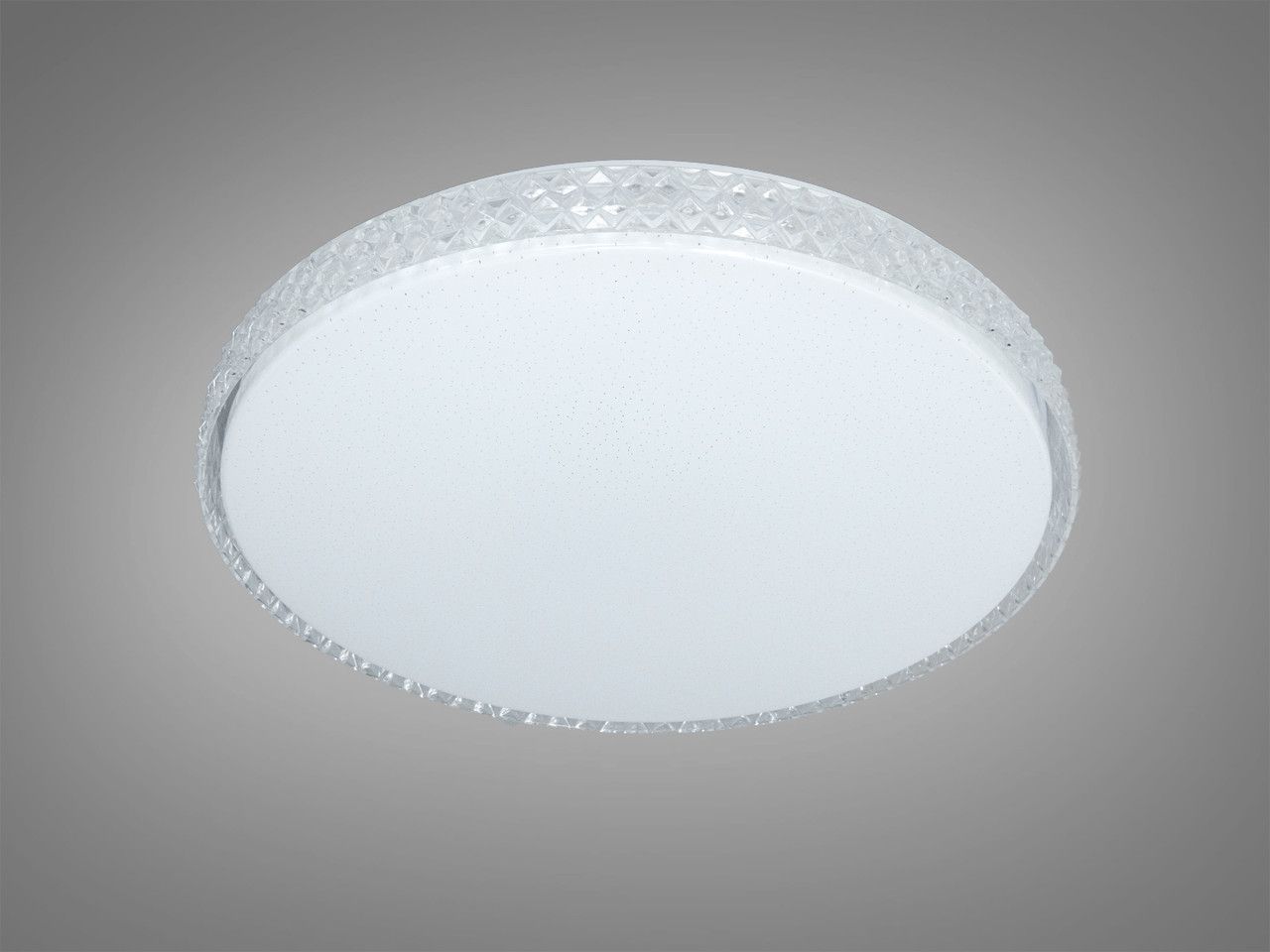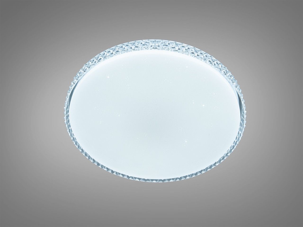 Модель выполнена в форме классического низкопрофильного диска диаметром 49 см. Плафон изготовлен из оптического акрила с изящным текстурированным ободком, имитирующим хрустальные грани. При включении поверхность плафона излучает мягкий равномерный свет с эффектом «звездного неба» (микроперфорация). Благодаря высоте всего 7 см, конструкция выглядит легкой и не перегружает пространство помещения.
