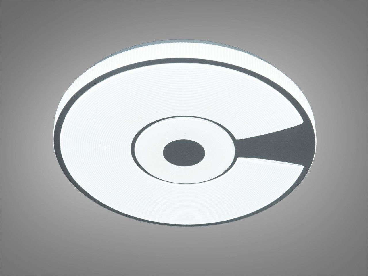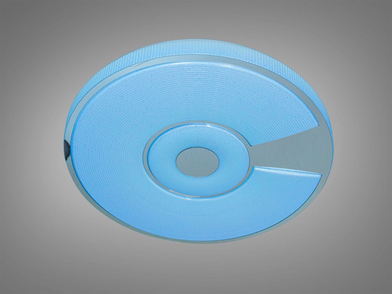 Модель выполнена в форме низкопрофильного диска диаметром 48 см с контрастным черным матовым ободком. Плафон из высококачественного акрила дополнен микроперфорацией («звездное небо»), создающей эффект уютного мерцания. Ключевая особенность — боковой ободок с вертикальной текстурой, который преломляет RGB-лучи, создавая насыщенный цветовой ореол. Черный контур основания добавляет прибору графичности и стиля.