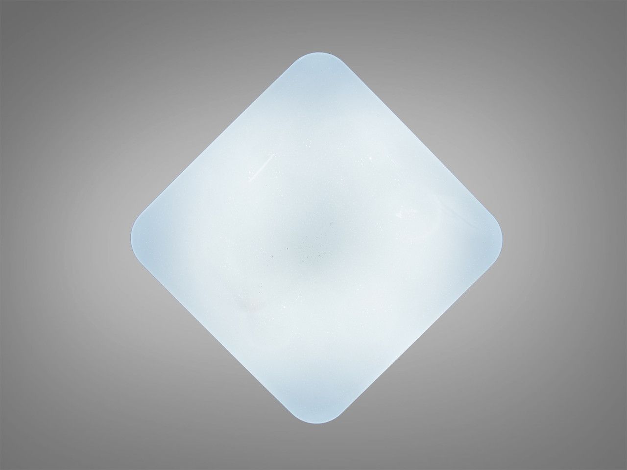 Модель выполнена в современной квадратной форме со скругленными углами (49х49 см). Белый матовый корпус изготовлен из металла, что гарантирует долговечность конструкции. Плафон из высококачественного акрила дополнен микроперфорацией: при включении создается эффект мерцающих звезд. Благодаря ультратонкому профилю (6.5 см), светильник практически сливается с потолком, сохраняя визуальный объем комнаты и безопасность при активных движениях.