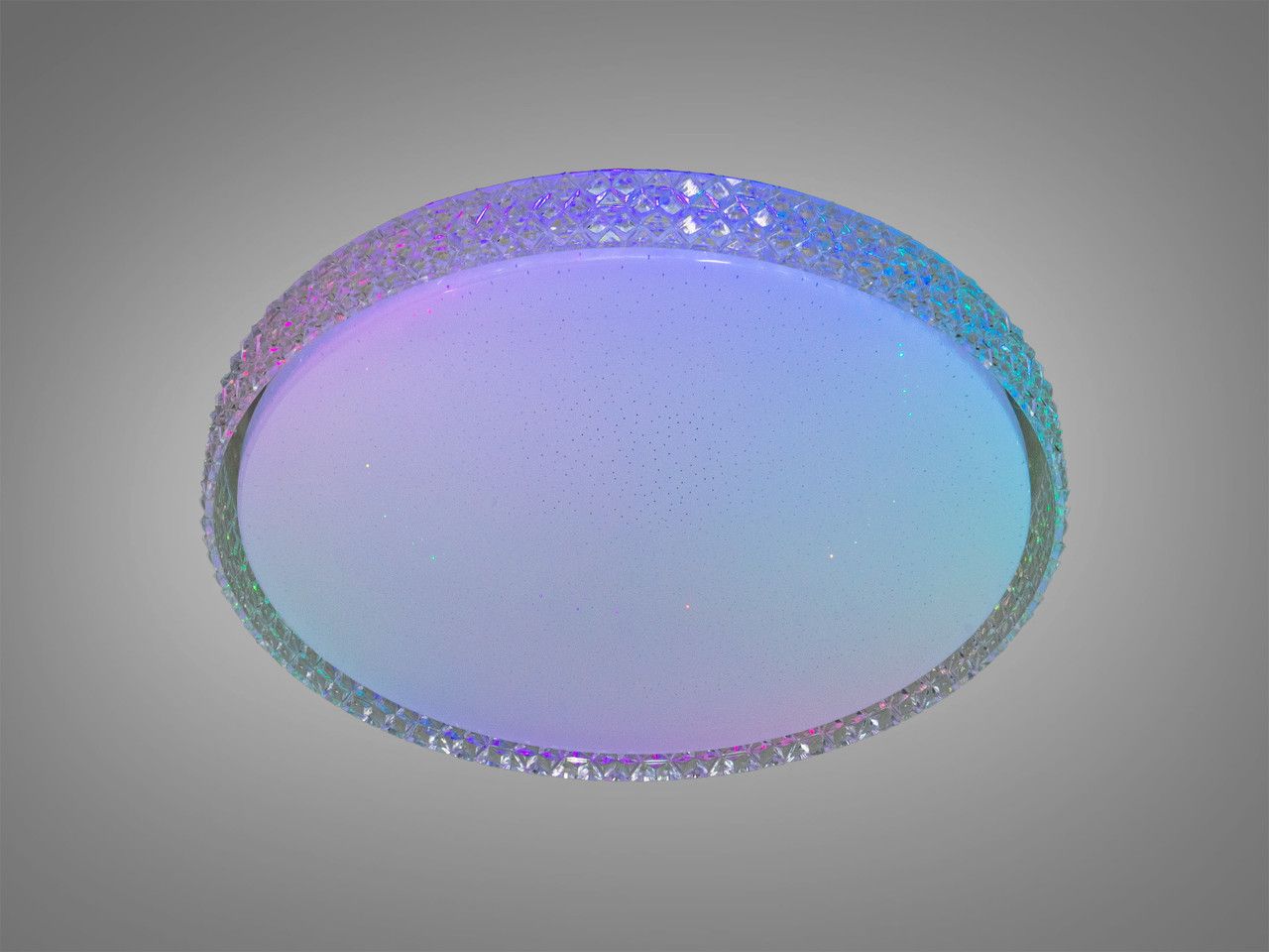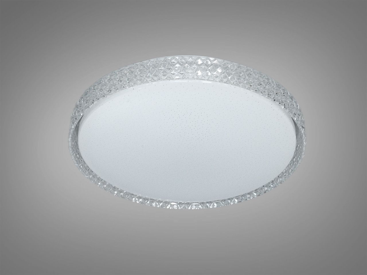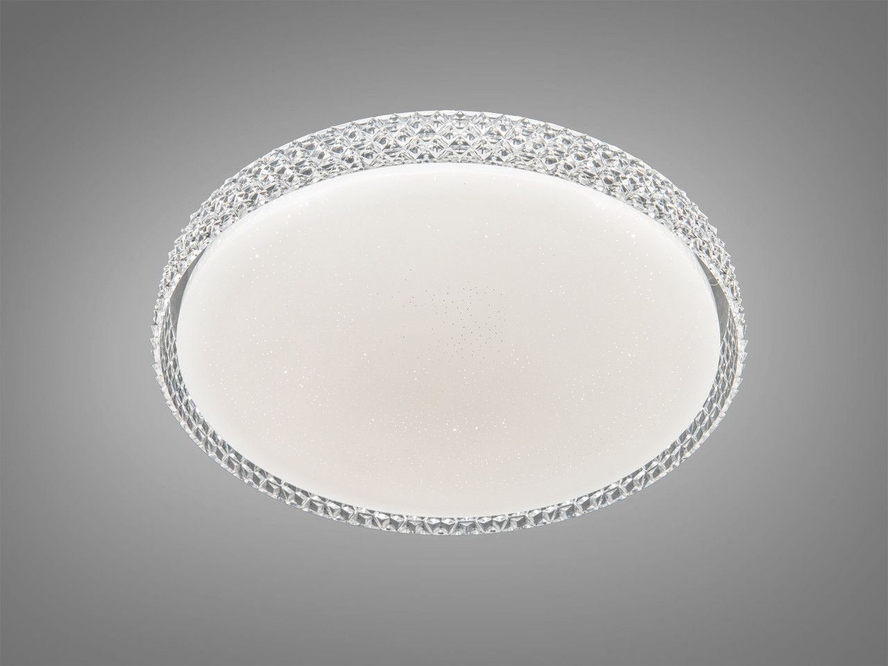 Модель выполнена в форме диска диаметром 40 см. Ключевой особенностью дизайна является широкий текстурированный край, имитирующий россыпь мелких кристаллов. При включении эти грани преломляют лучи, создавая сверкающий ореол вокруг прибора. Центральная часть плафона дополнена микроперфорацией («звездное небо»), обеспечивающей уютное мерцание. Благодаря высоте всего 7 см, люстра выглядит интегрированной в потолок, не загромождая пространство.