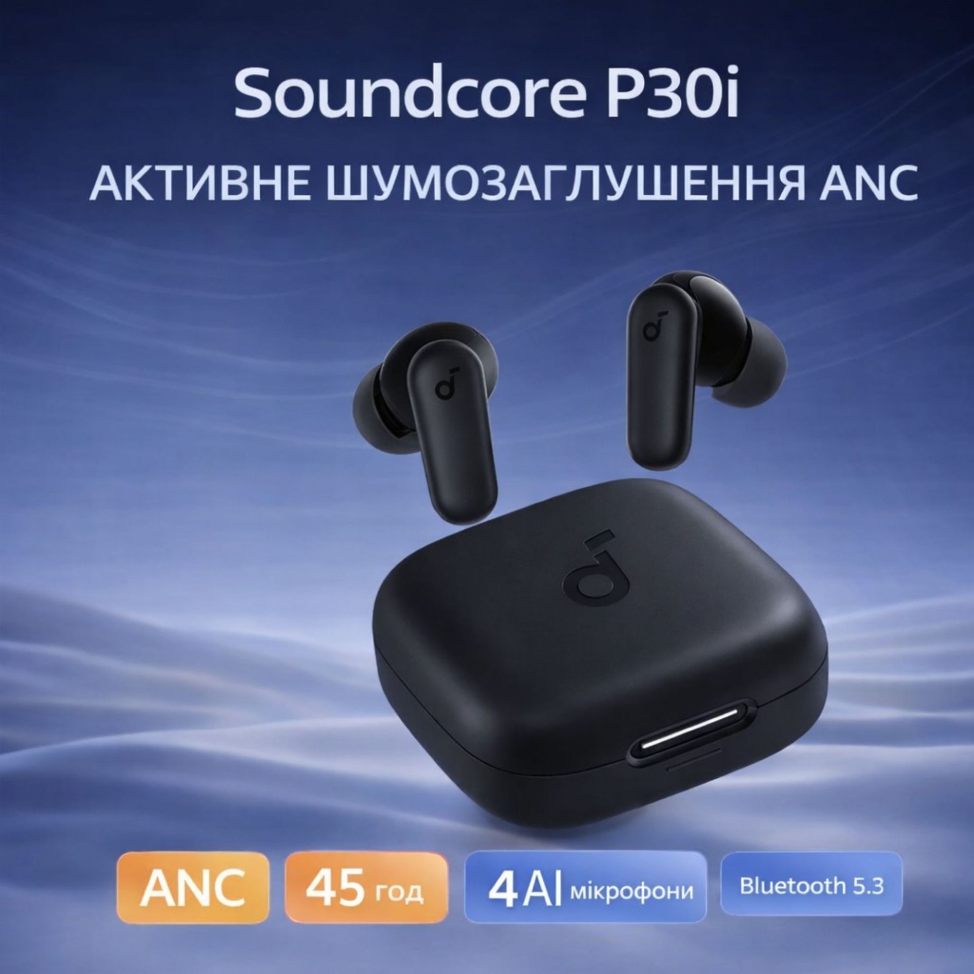 Беспроводные наушники Soundcore P30i с активным шумоподавлением ANC, Bluetooth 5.3, 45 ч работы, 4 микрофона AI, быстрая зарядка Black