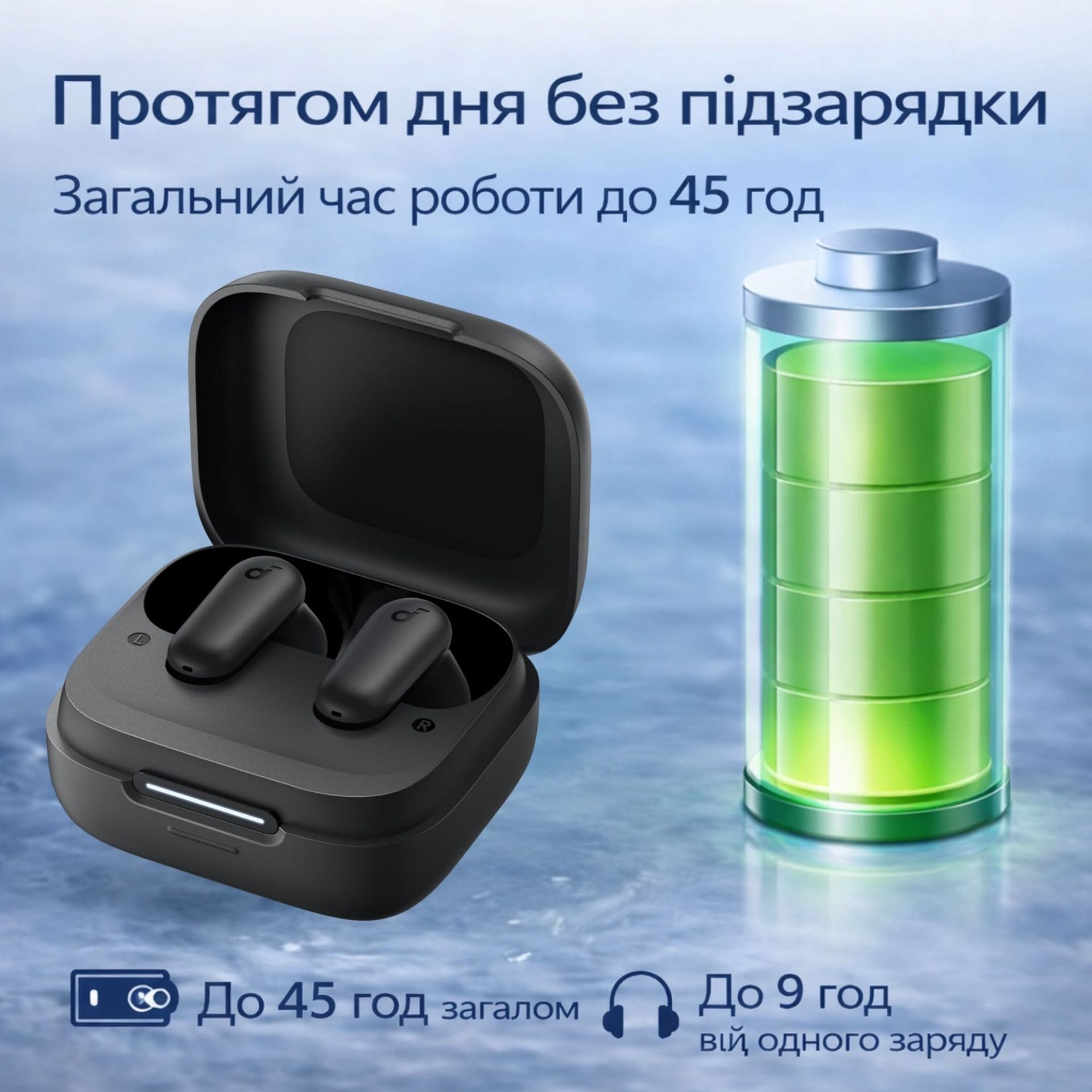 Наушники работают до 45 часов от одного заряда вместе с кейсомчто делает их идеальным выбором для путешествий, спорта, работы и ежедневного использования.