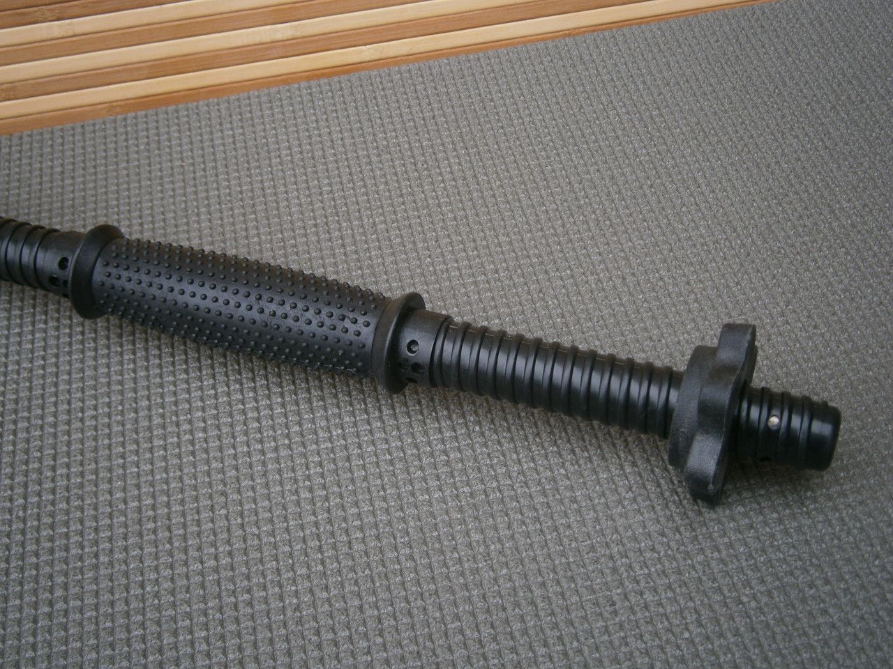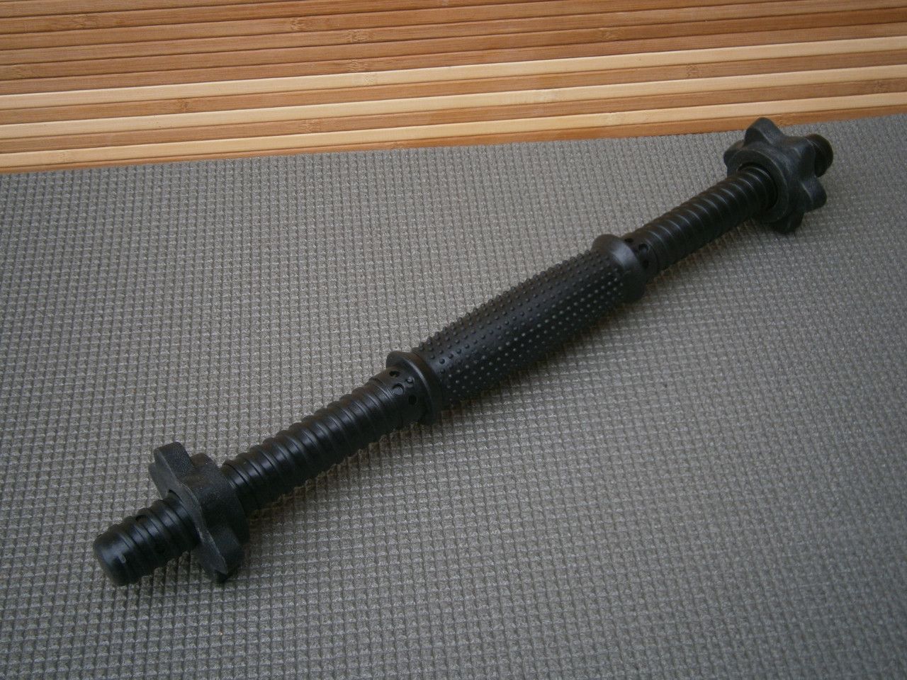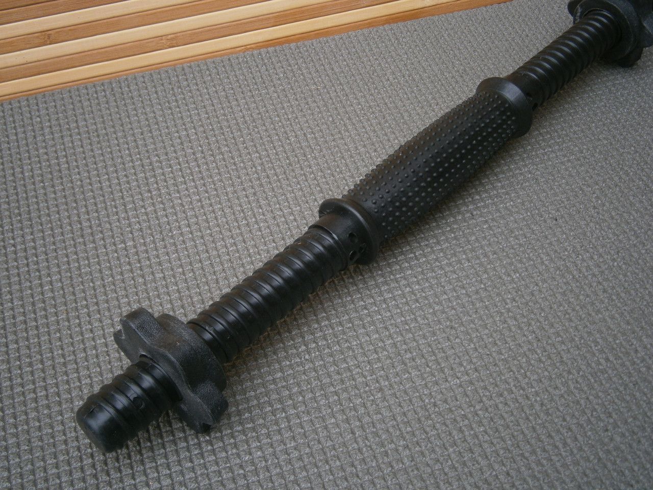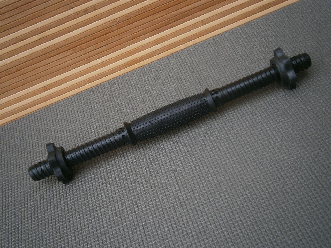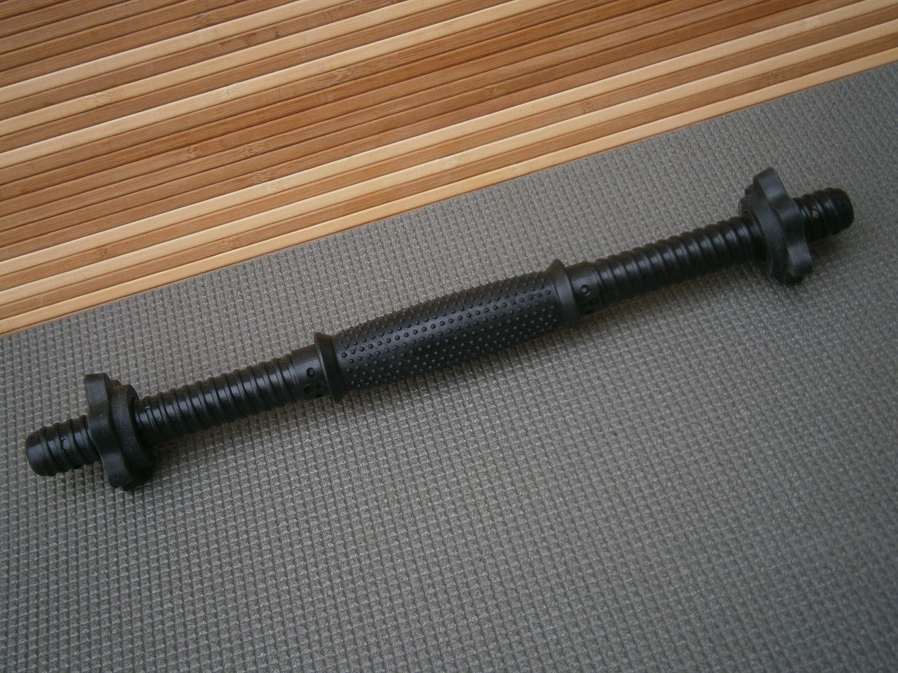 Этот гриф производится методом литья под давлением из высокопрочного пластика, устойчивого к ударам и механическим нагрузкам. Для фиксации на нем блинчиков есть винтовые замки, так называемые гайки Вейдера, которые надежно их удерживают и в то же время позволяют быстро прибавить/уменьшить вес. Обрезиненная поверхность и рифленая рукоять обеспечивают надежный хват и безопасность тренировок. Гриф может использоваться с любыми блинами соответствующего диаметра.