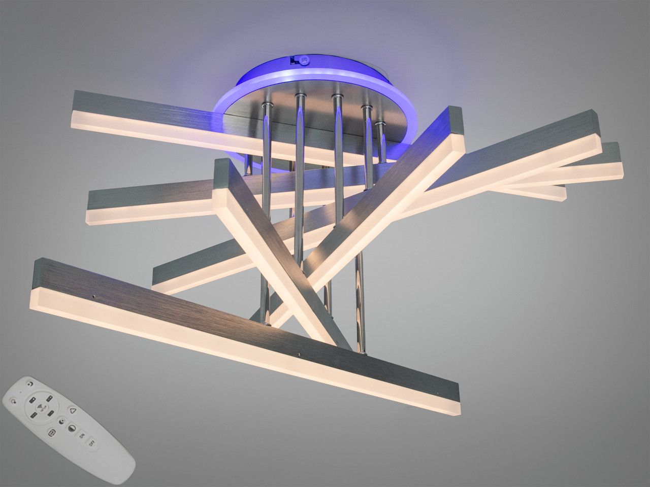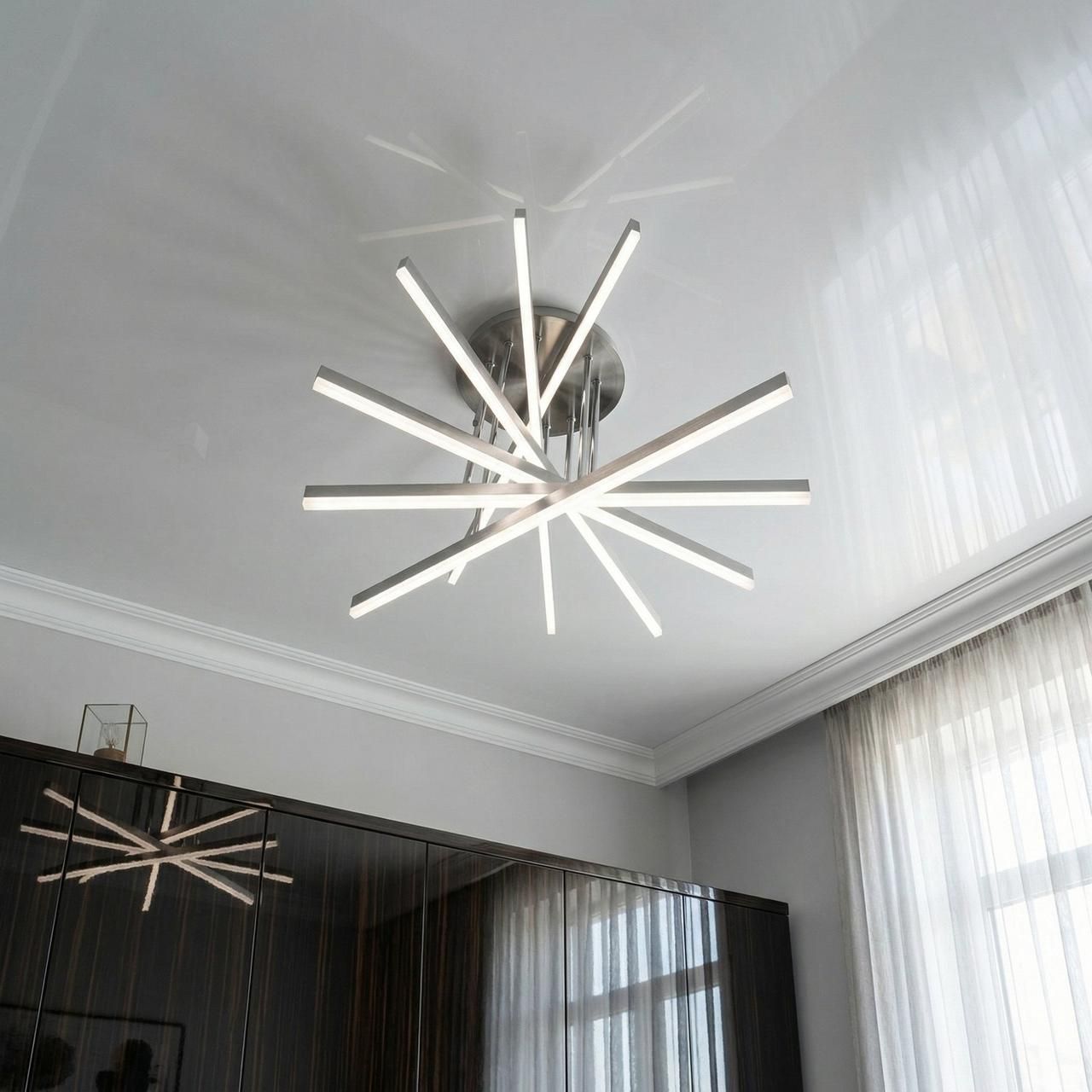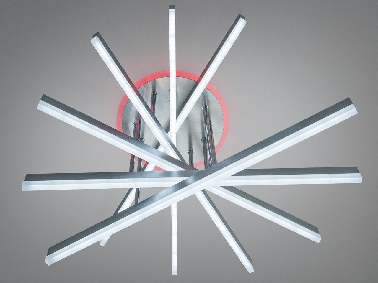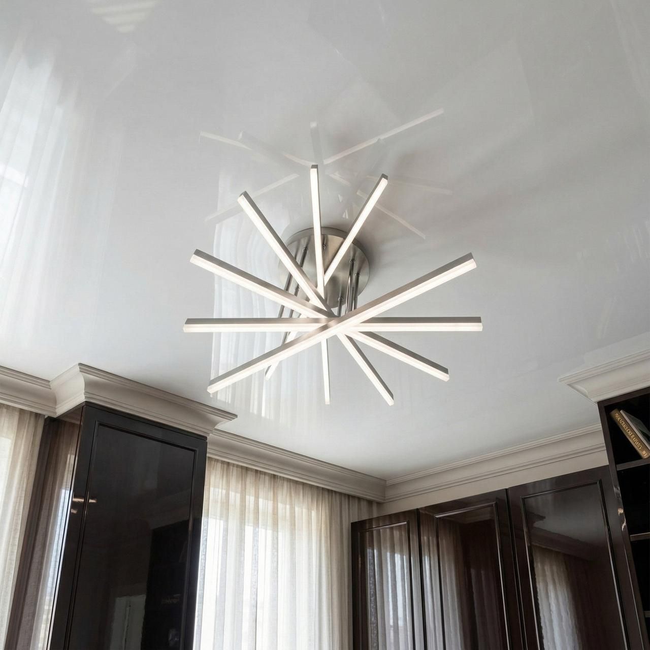 Сверхмощное архитектурное решение для просторных гостиных и залов площадью до 20 м². Благодаря уникальной форме перекрестных лучей, напоминающих раскрытый веер, и благородному покрытию «матовый хром», люстра становится центральным арт-объектом интерьера.