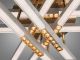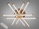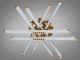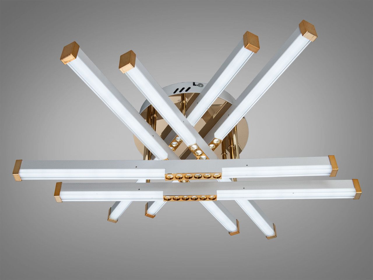 Модель выполнена в стиле современного минимализма с элементами хай-тека. Конструкция состоит из восьми световых сегментов («лучей»), которые пересекаются на разных уровнях, образуя объемную световую решетку. Корпус изготовлен из металла: основная часть имеет качественное белое покрытие, а наконечники лучей выделены зеркальным золотым покрытием (гальваника). Рассеиватели из матового акрила обеспечивают равномерную заливку светом без резких теней и ослепляющего эффекта.
