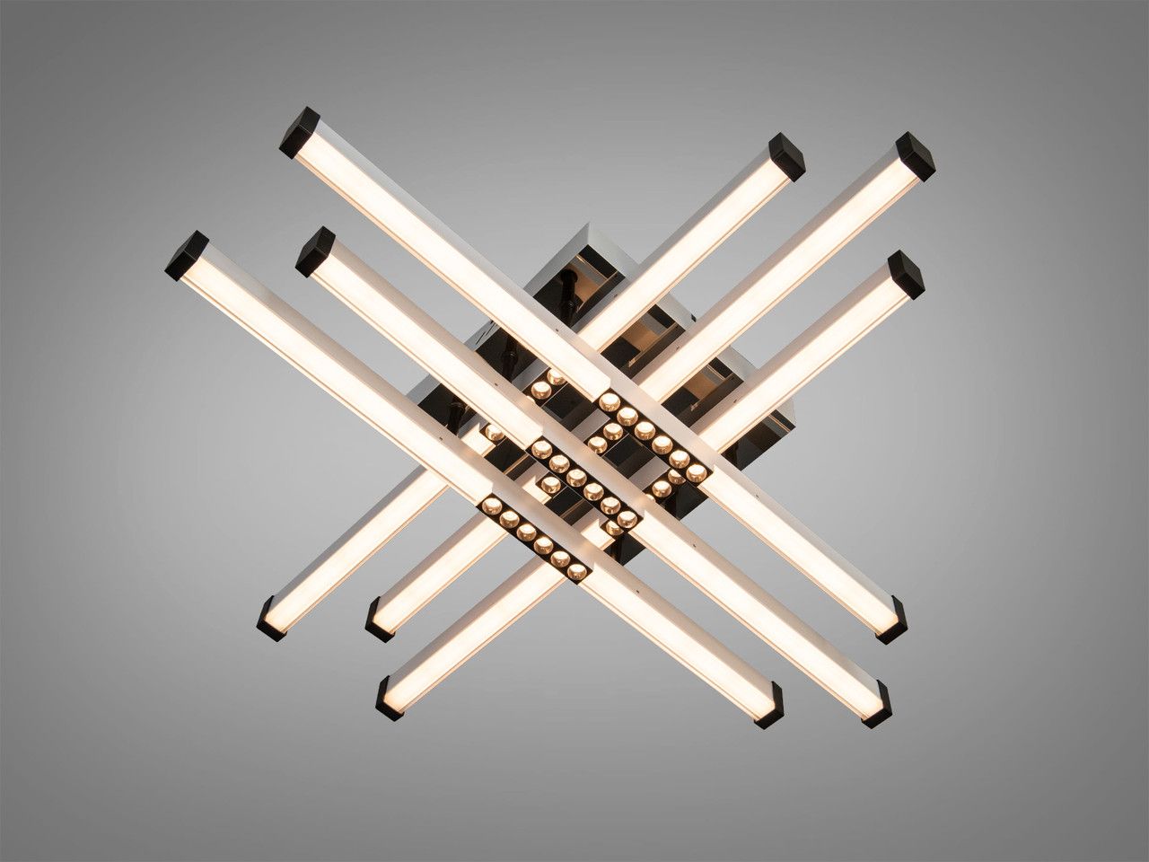 Модель выполнена в стиле геометрического минимализма. Композиция состоит из восьми световых сегментов («лучей»), которые пересекаются под прямым углом на квадратном основании. Корпус изготовлен из металла с качественным порошковым покрытием: белый цвет плафонов эффектно дополнен черными акцентными элементами. Рассеиватели из высококачественного акрила обеспечивают равномерную заливку светом без резких теней и ослепляющего эффекта, что особенно важно для детского зрения.