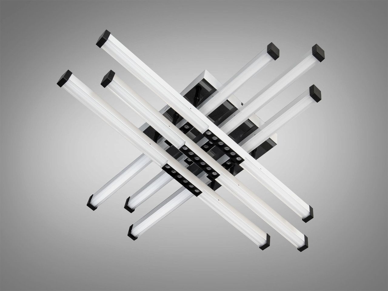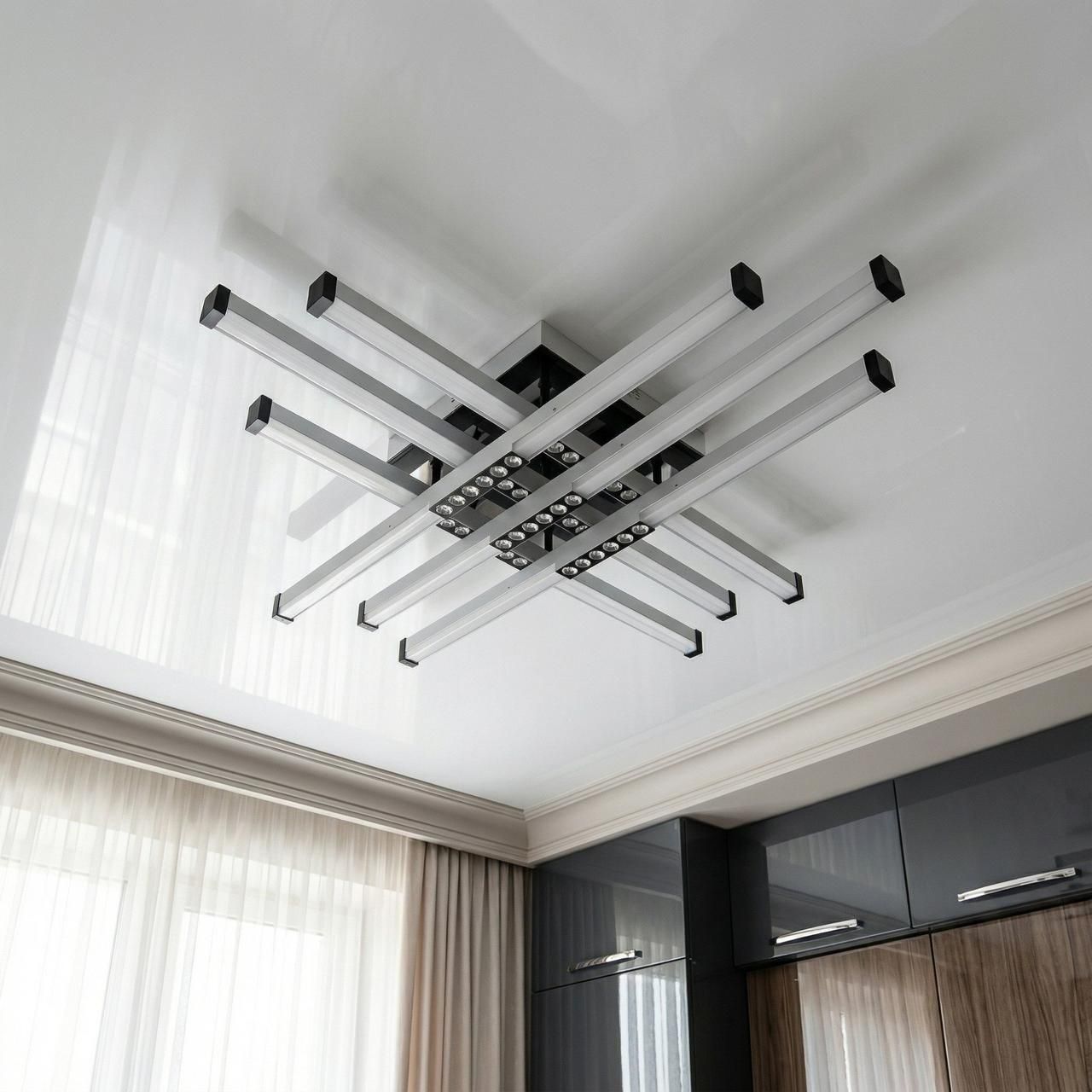 Футуристичное и функциональное световое решение для детских комнат и современных интерьеров площадью до 16 м². Сочетание черных и белых световых линий создает динамичный визуальный эффект, обеспечивая равномерное освещение всего пространства.