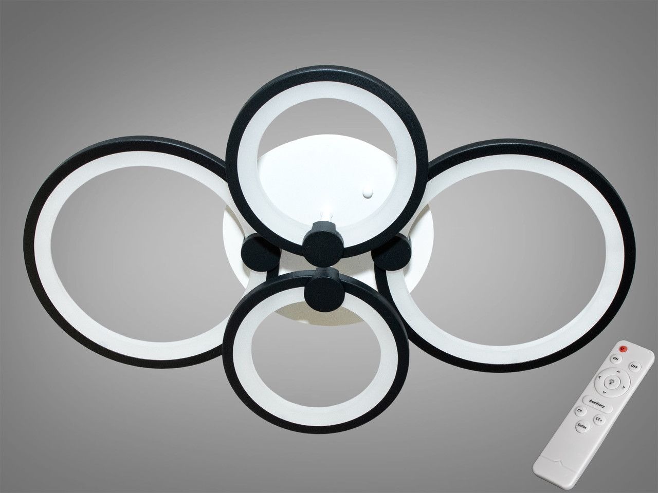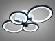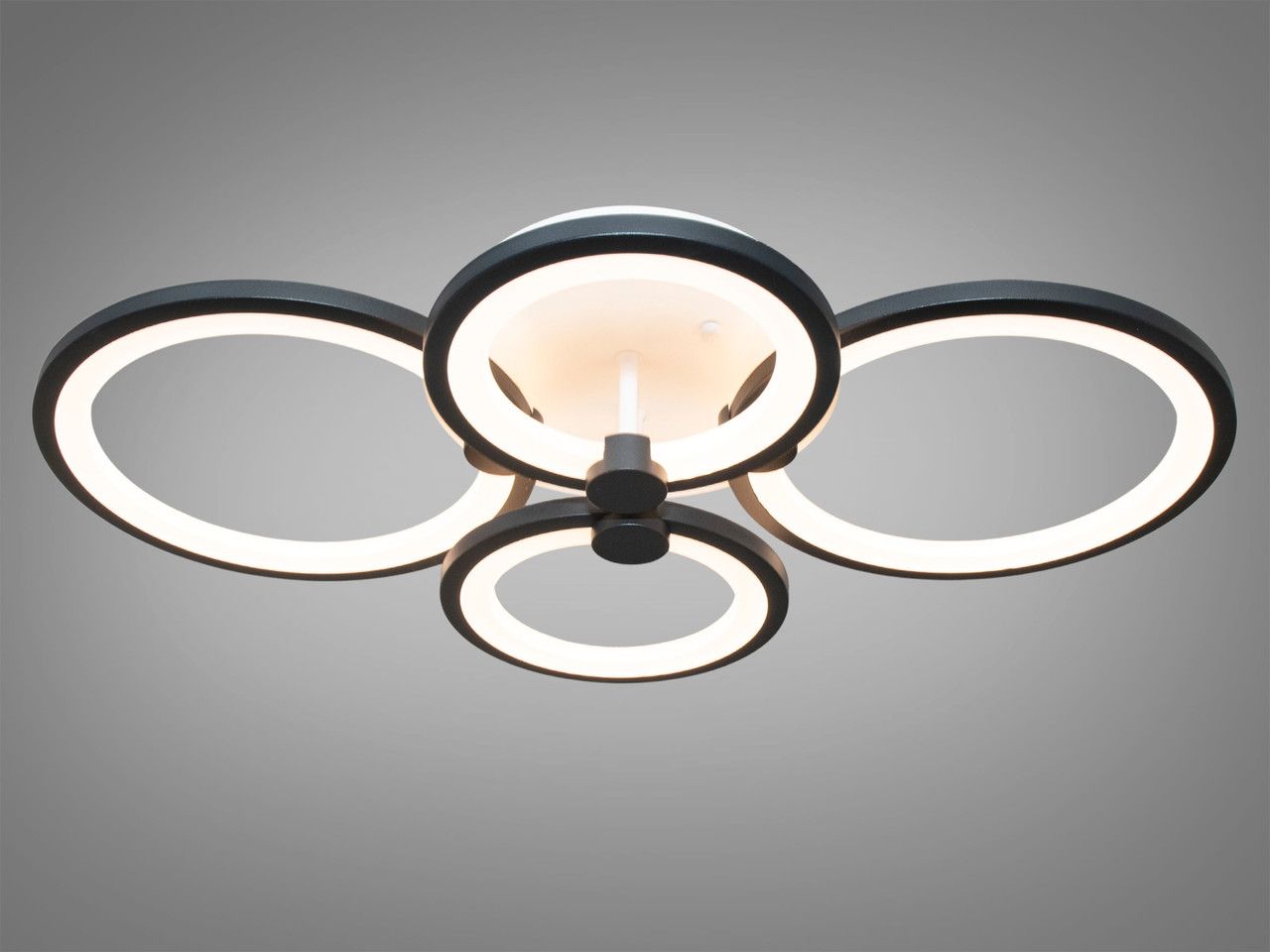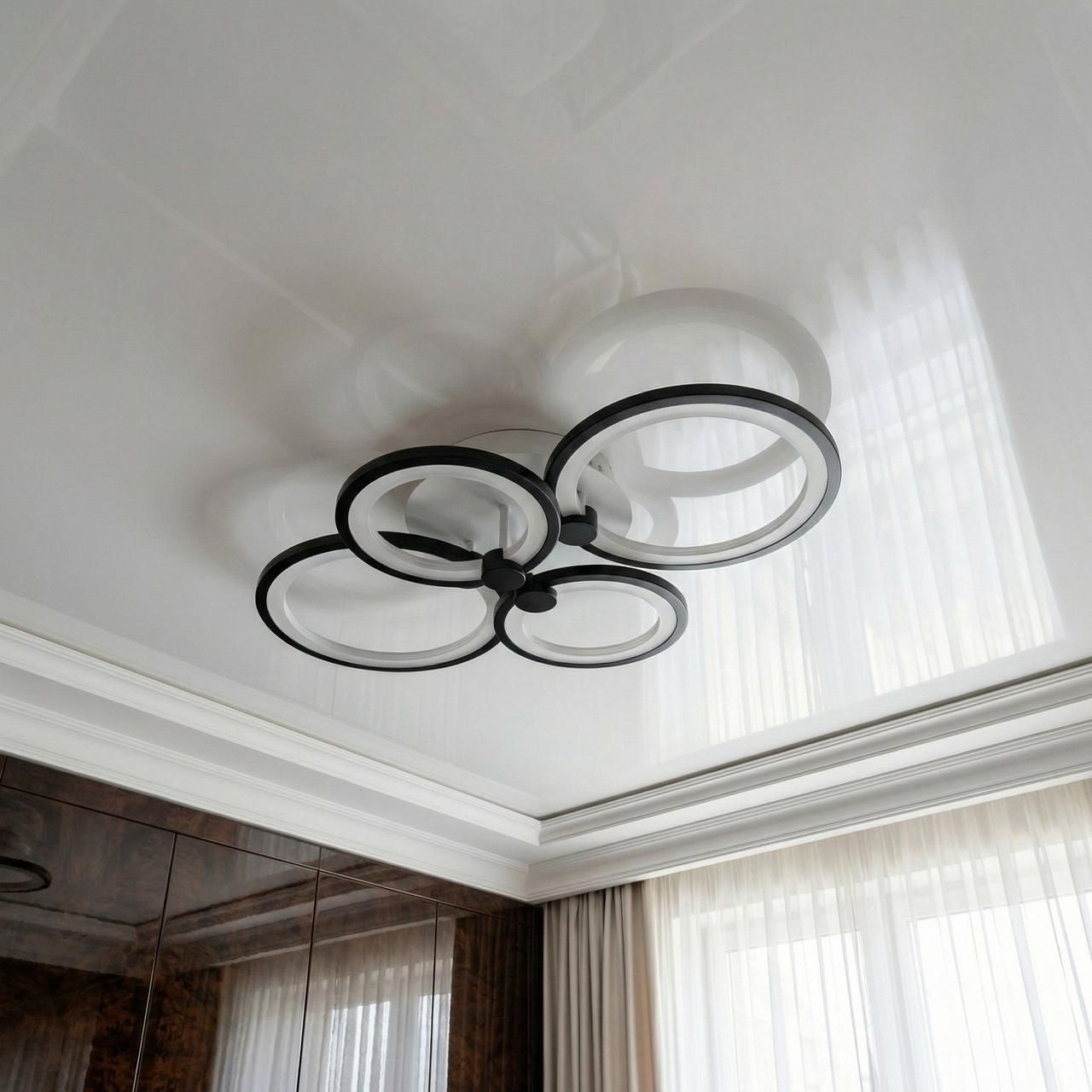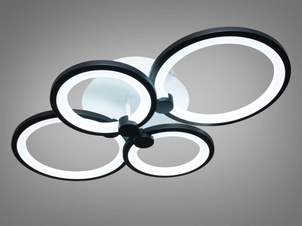 Модель выполнена в стиле геометрического минимализма. Конструкция состоит из четырех переплетенных световых колец разного диаметра, создающих легкий и объемный силуэт. Корпус изготовлен из металла с качественным черным порошковым покрытием, а рассеиватели — из высококачественного акрила. Черный цвет корпуса создает эффектный контраст с поверхностью потолка, подчеркивая современный характер пространства.