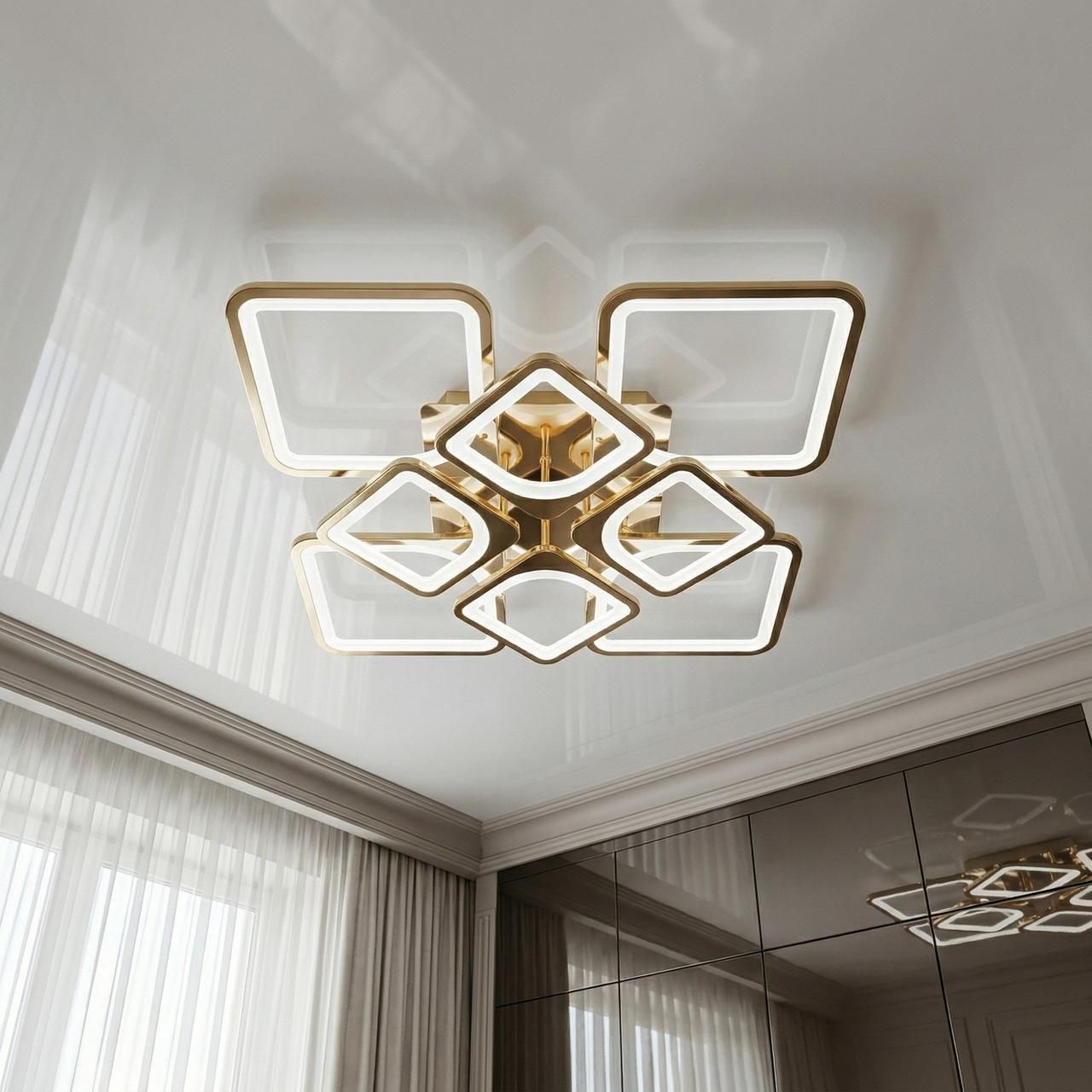 Сверхмощное и статусное световое решение для просторных гостиных и залов площадью до 20 м². Благодаря сложной двухуровневой композиции из восьми световых квадратов и премиальному золотому покрытию, люстра становится центральным арт-объектом интерьера, обеспечивая безупречную яркость.
