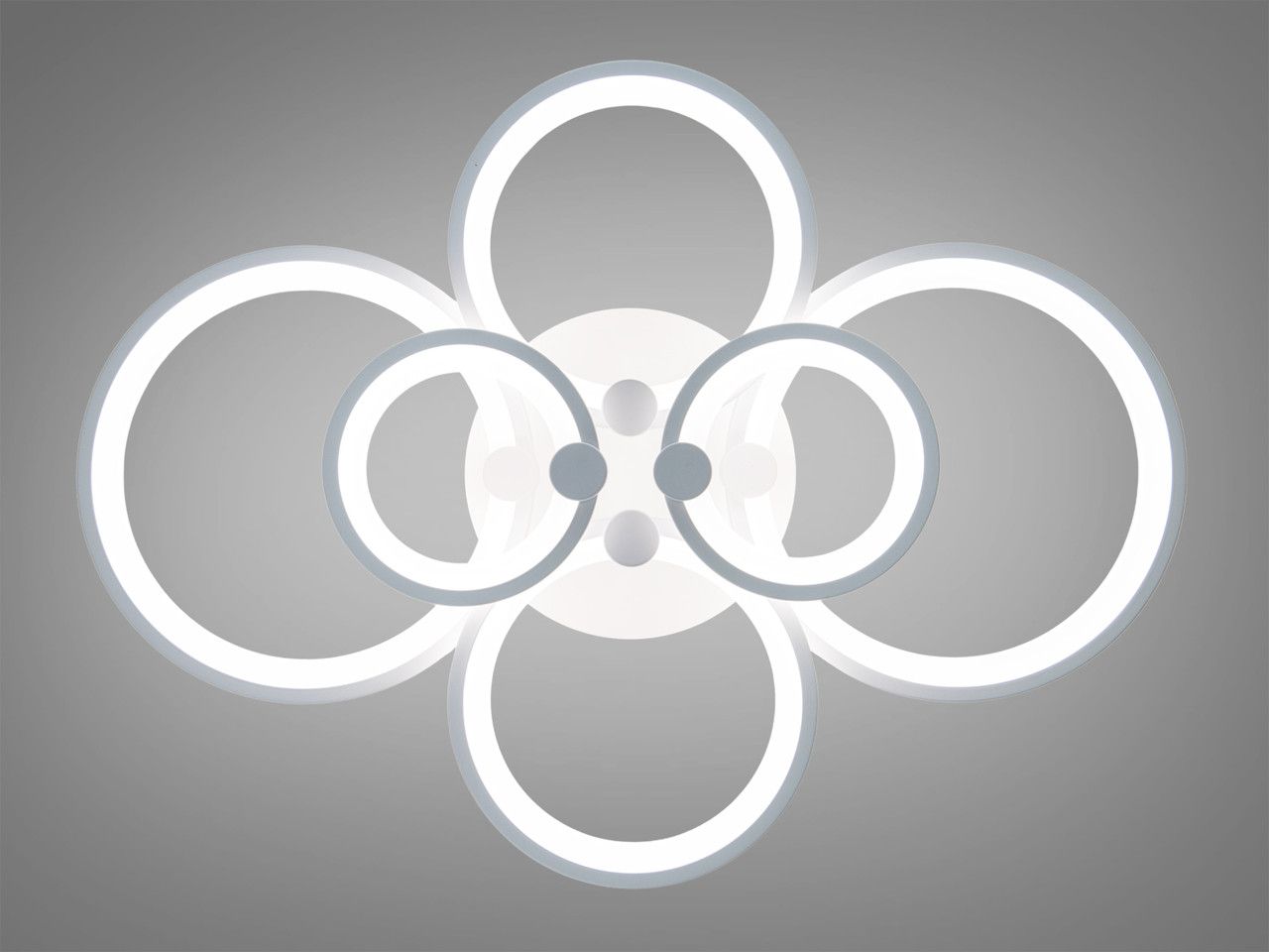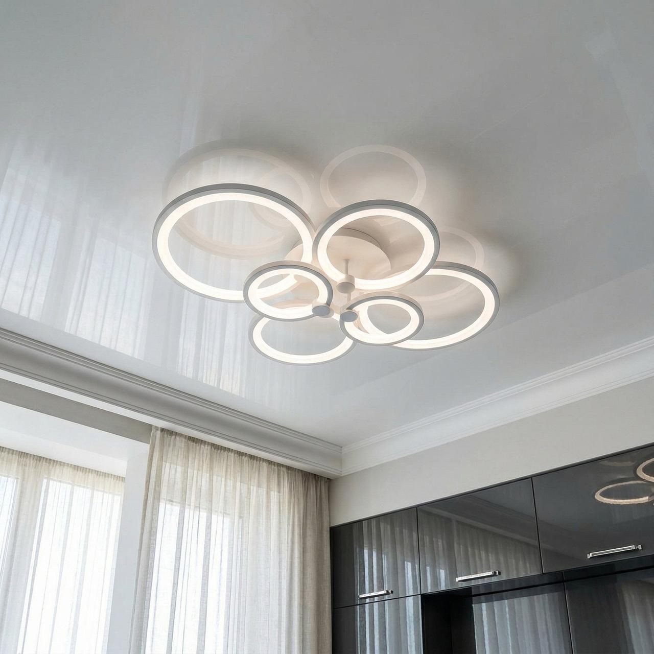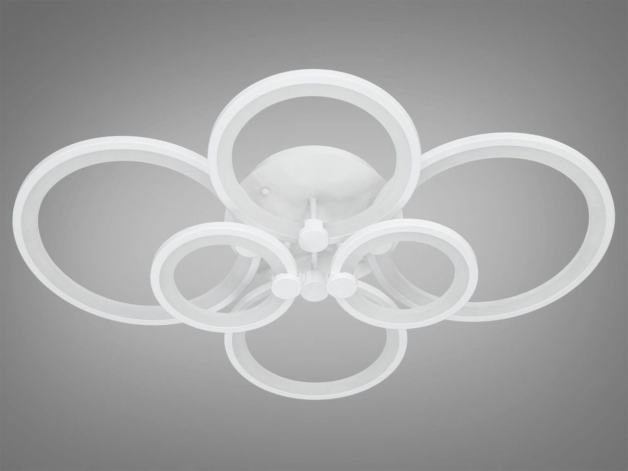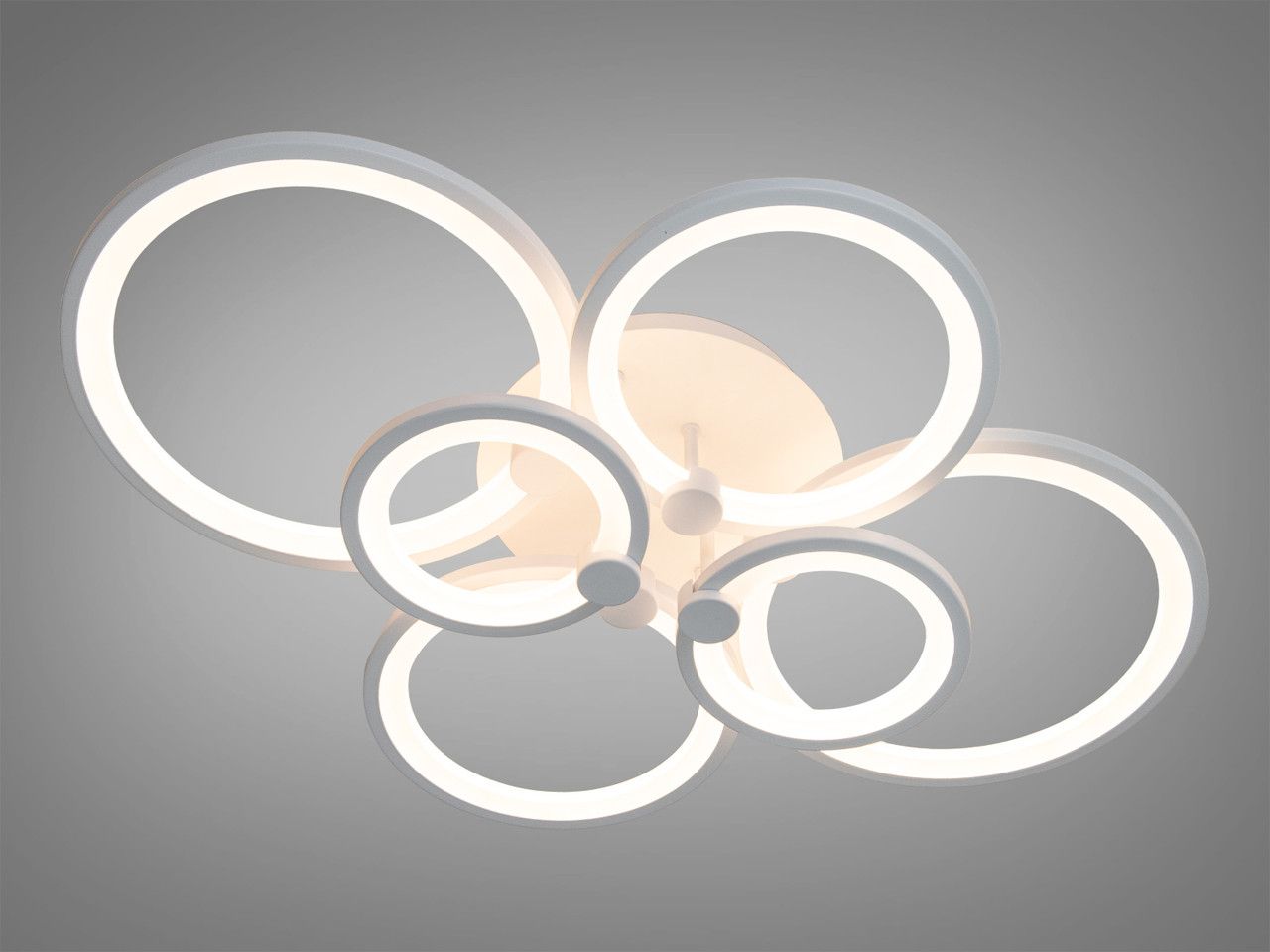 Модель выполнена в стиле геометрического минимализма. Шесть переплетенных колец разного диаметра создают эффект воздушного облака, которое визуально облегчает конструкцию. Корпус изготовлен из металла с качественным белым матовым покрытием, что позволяет прибору гармонично сливаться с поверхностью потолка. Рассеиватели из высококачественного акрила обеспечивают равномерную заливку светом без резких теней и ослепляющего эффекта.