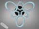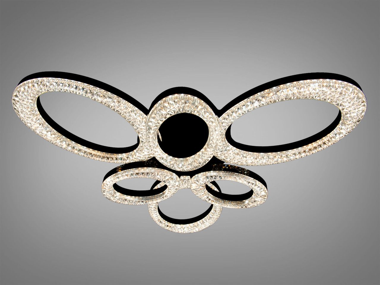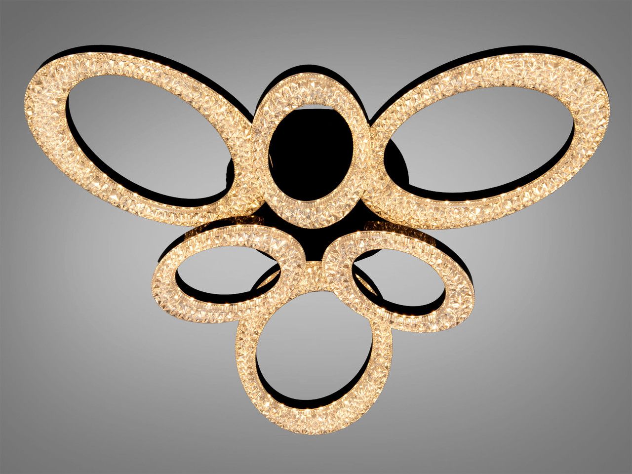 Модель выполнена в стиле геометрического минимализма с элементами лофта. Шесть переплетенных колец разного диаметра создают динамичный силуэт, напоминающий крылья бабочки. Корпус изготовлен из металла с качественным черным матовым покрытием. Боковые грани украшены фактурным акрилом с эффектом «хрустальной крошки», который преломляет свет диодов и создает игру искристых бликов на потолке и стенах.