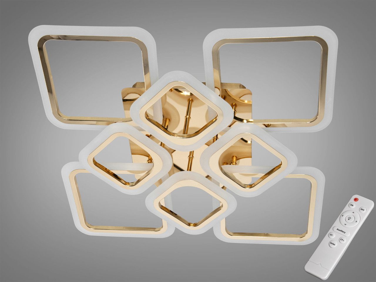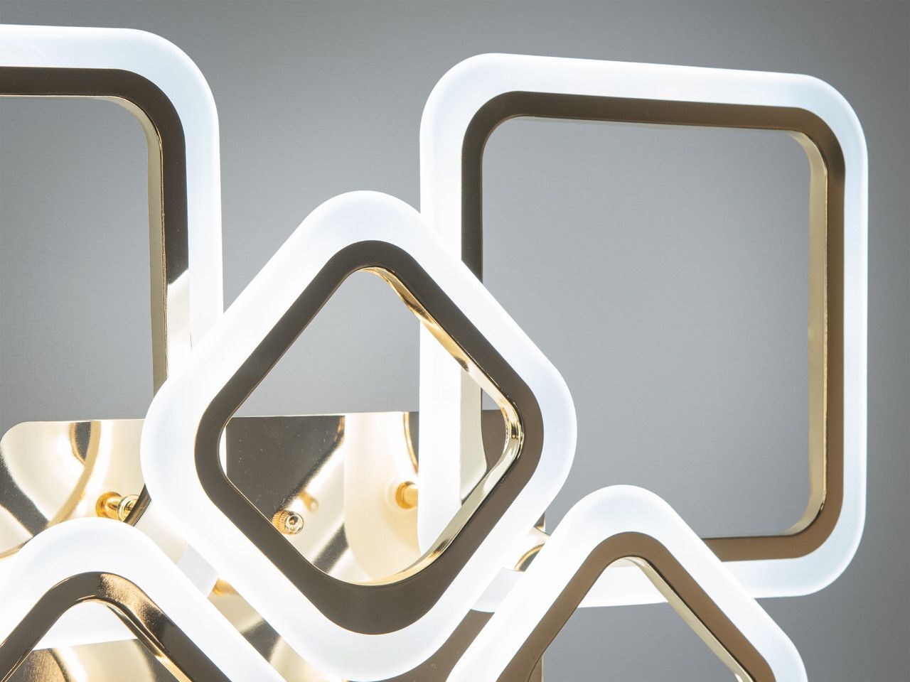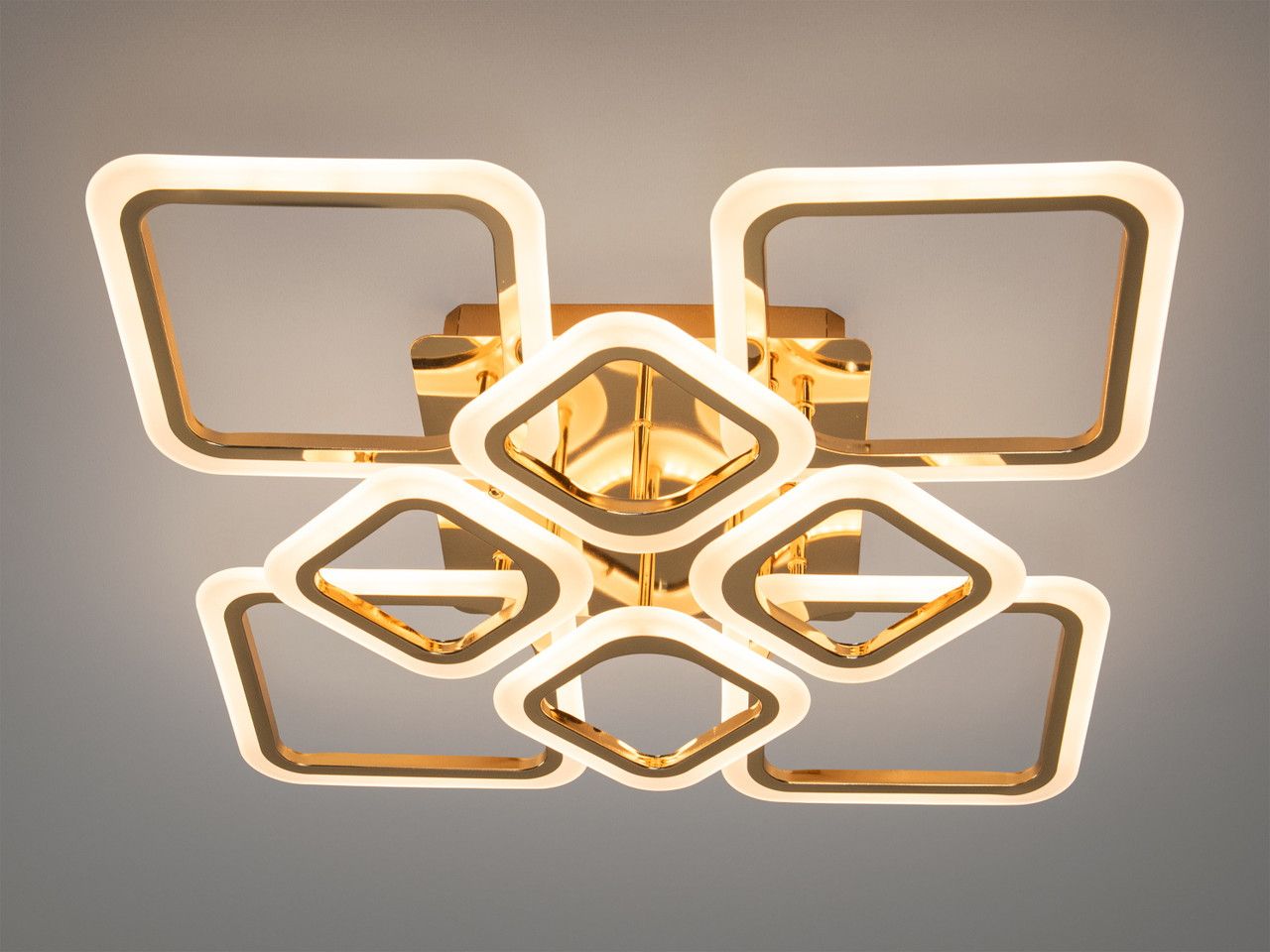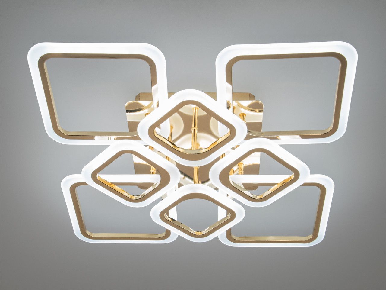 Модель выполнена в стиле геометрического минимализма. Восемь квадратных рамок, расположенных в два уровня, создают динамичный и легкий силуэт. Корпус изготовлен из металла с качественным золотым покрытием, обеспечивающим благородный блеск. Рассеиватели из высококачественного акрила равномерно распределяют световой поток (5775 Лм), полностью скрывая точки светодиодов и создавая комфортный визуальный фон.