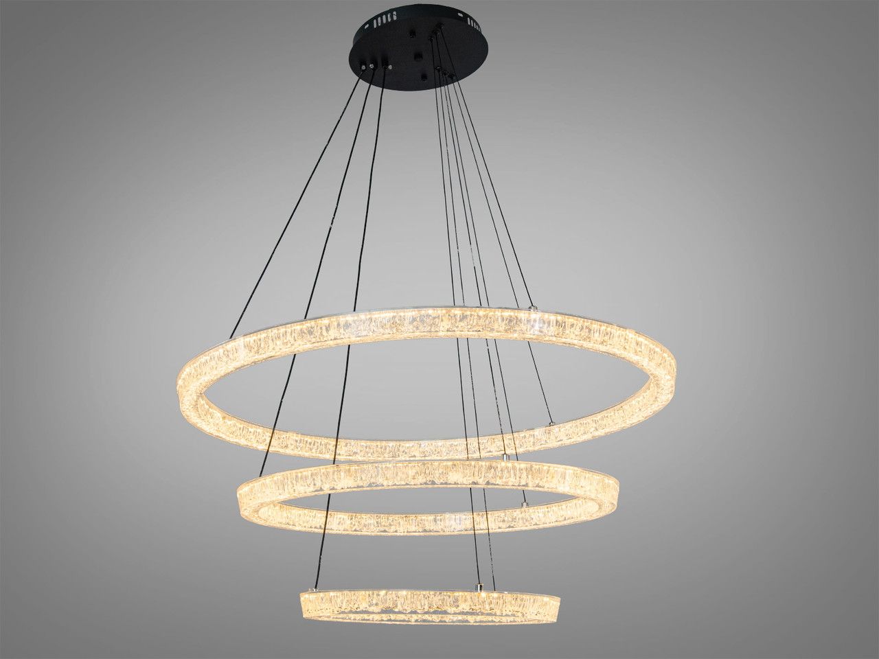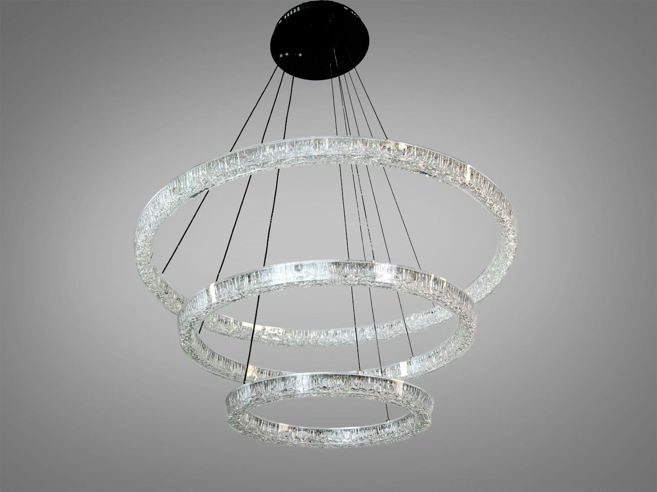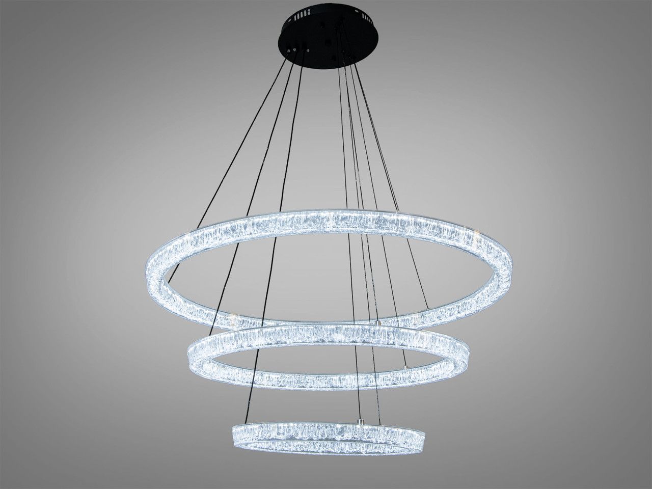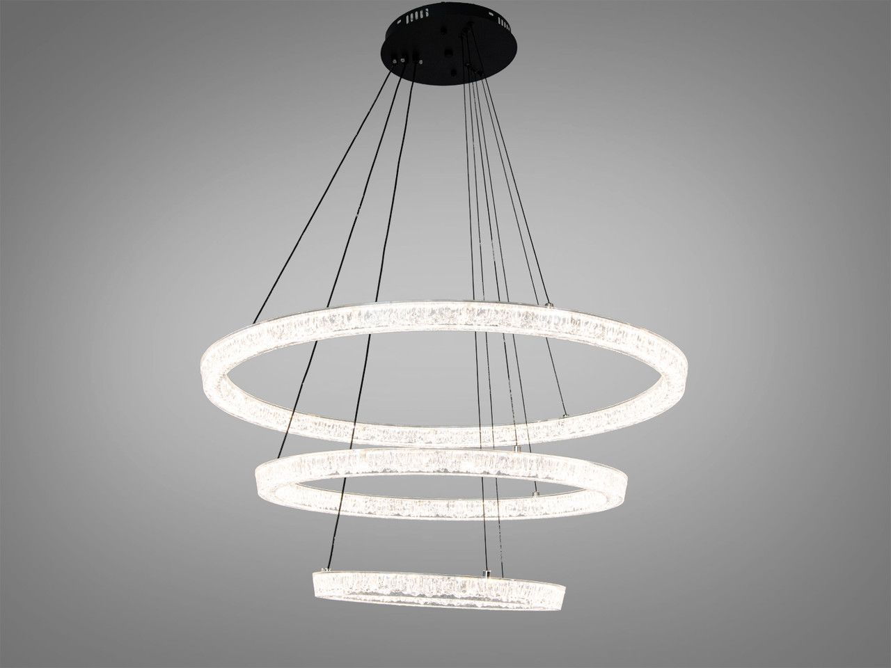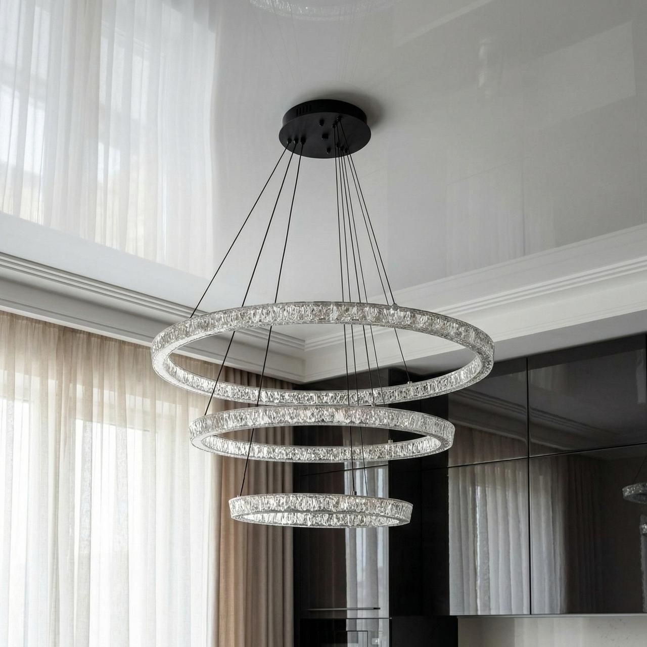 Модель выполнена в стиле современного минимализма и лофта. Композиция состоит из трех переплетенных световых колец разного диаметра (80 см, 60 см и 40 см), подвешенных на стальных регулируемых тросах. Корпус изготовлен из металла с качественным черным матовым покрытием, которое подчеркивает строгость и премиальность изделия. Рассеиватели из высококачественного акрила обеспечивают равномерную заливку светом на 360°, полностью скрывая точки светодиодов.