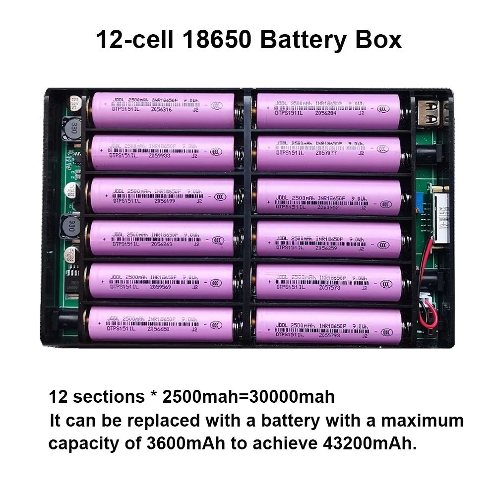 - Позволяет самостоятельно выбрать и установить до 12 аккумуляторов 18650, регулируя итоговую ёмкость и время автономной работы.