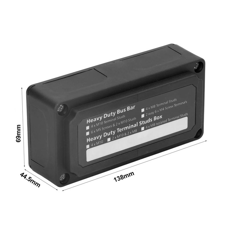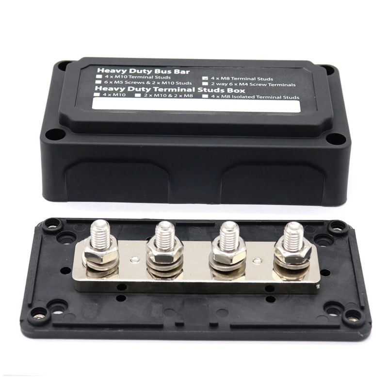 Распределительный блок Heavy Duty BusBar предназначен для коммутации низковольтных кабелей постоянного тока с напряжением до 48 вольт, опрессованных клеммами с отверстиями под размер болта М8 в единую систему. Распределительный блок имеет массивную шину из нержавеющей стали с 4-мя шпильками M8, высотой 18 мм, что позволяет соединить между собой до 8 клемм (по 2 клеммы на шпильку).