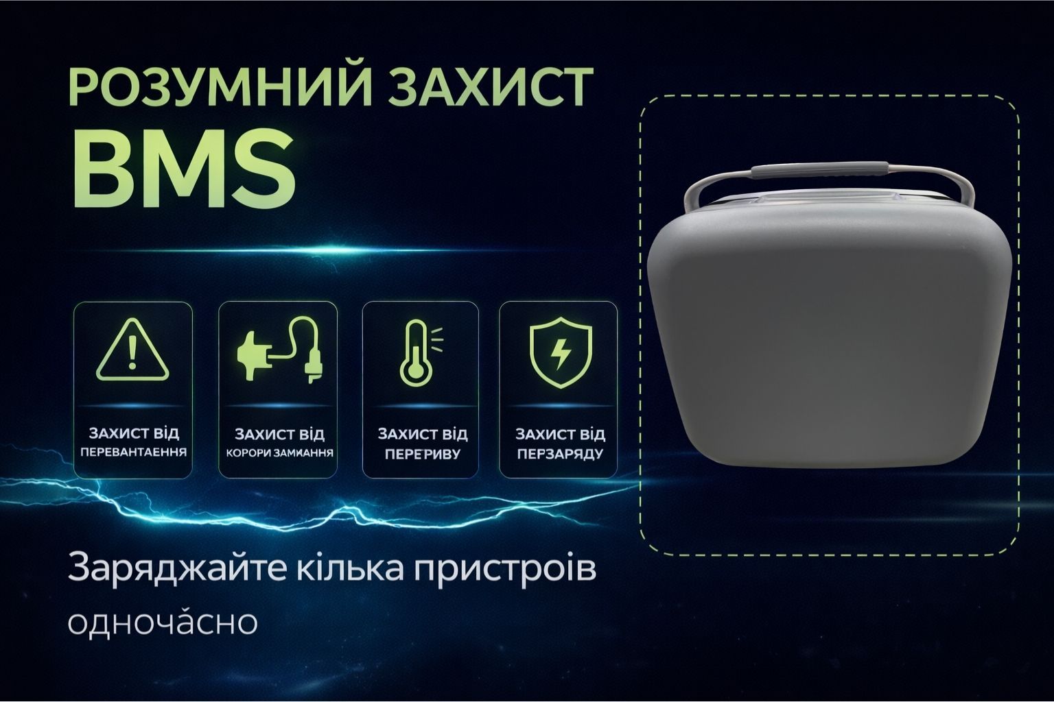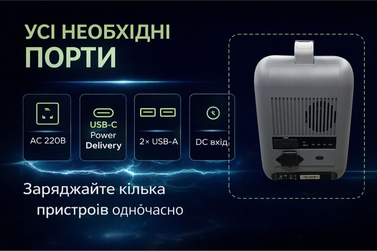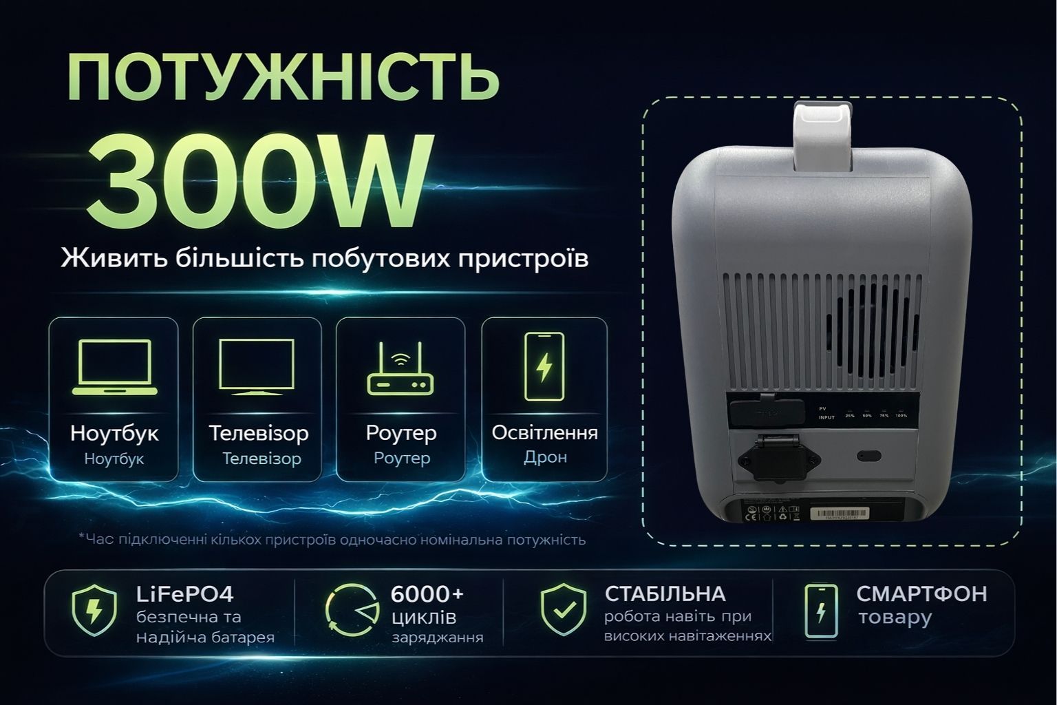 Станция оснащена современной батареей LiFePO4, которая обеспечивает более 6000 циклов зарядки, повышенную безопасность и стабильную работу на протяжении многих лет. Это оптимальное решение как резервный источник питания для дома, да и мобильная электростанция для путешествий.
