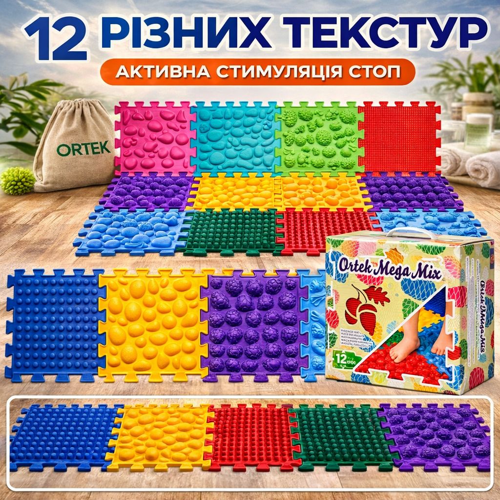 Ортек Mega Mix (12 элементов) – это набор массажных ковриков-пазлов с разными рельефами, который создает естественную стимуляцию стоп и помогает снизить усталость уже с первых использований.