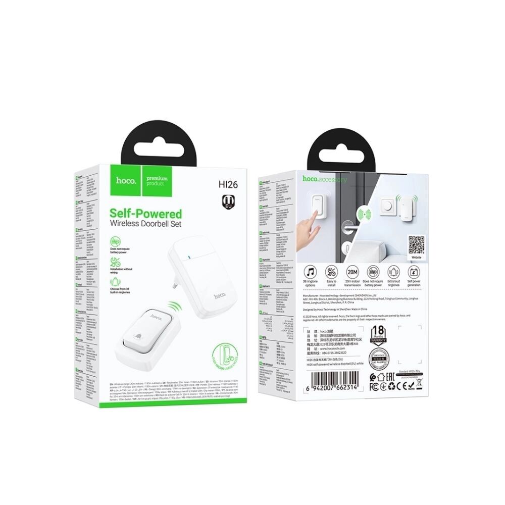 Беспроводной дверной звонок HOCO HI26 — это современное и практичное решение для дома, квартиры, офиса или дачи. Основная особенность модели — технология self-powered, благодаря которой кнопка передатчика не требует батареек: энергия для работы генерируется при нажатии. Это делает устройство полностью автономным, экологичным и избавляет от необходимости замены элементов питания.