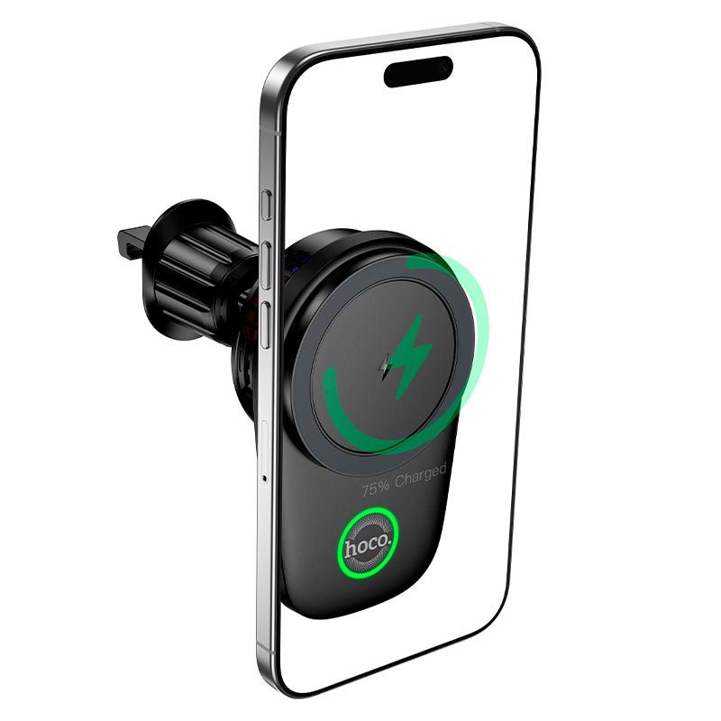 HOCO HW36 — это современный автомобильный держатель с поддержкой быстрой беспроводной зарядки, предназначенный для установки в вентиляционную решетку (воздуховод). Устройство сочетает в себе мощную магнитную фиксацию, интеллектуальную систему охлаждения и функцию электрического поворота, обеспечивая максимальный комфорт и безопасность при использовании смартфона в дороге.