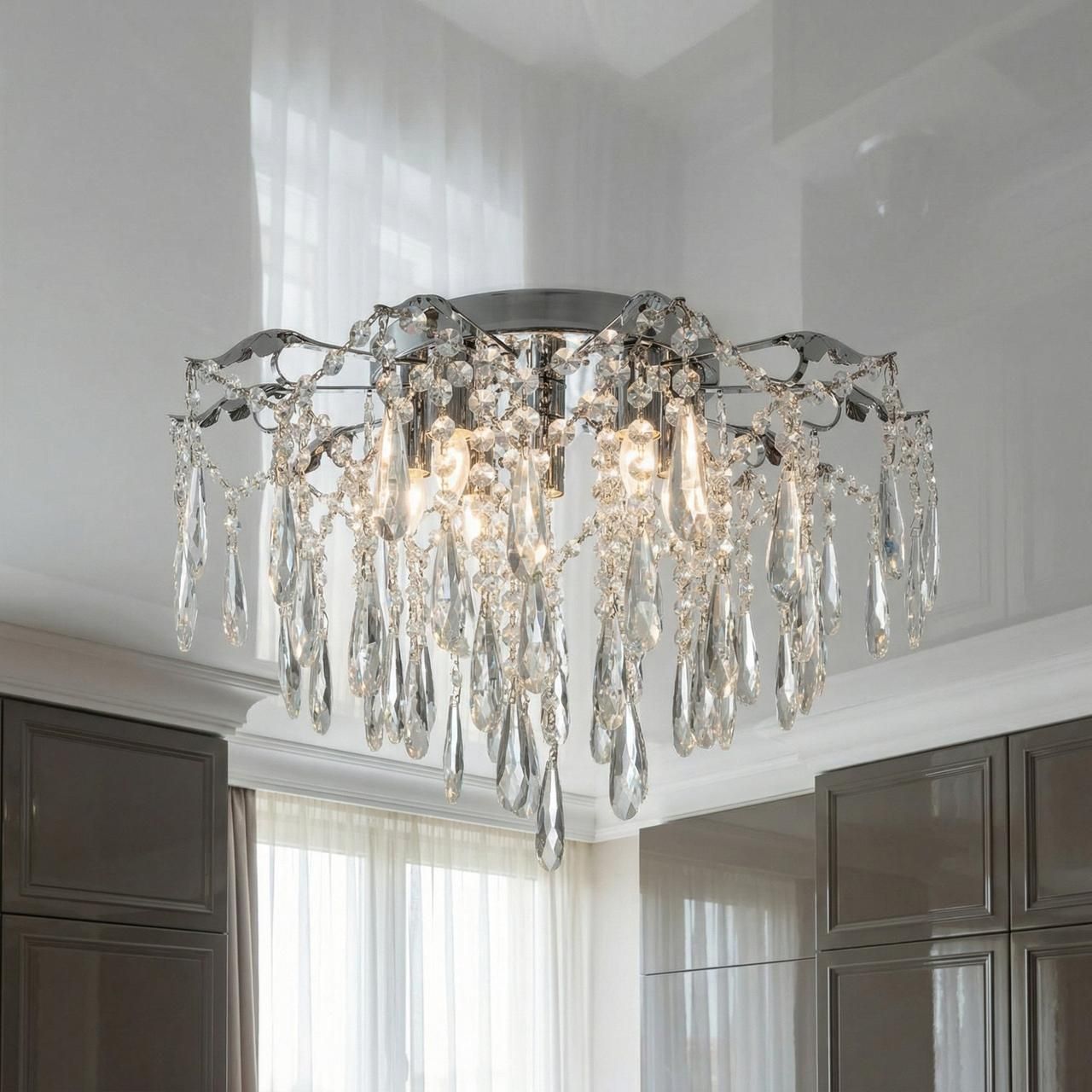 Классический каскадный дизайн подчеркивает строгость и статусность интерьера. Светильник монтируется близко к потолку, сохраняя ощущение свободного пространства, что особенно важно для городских квартир.