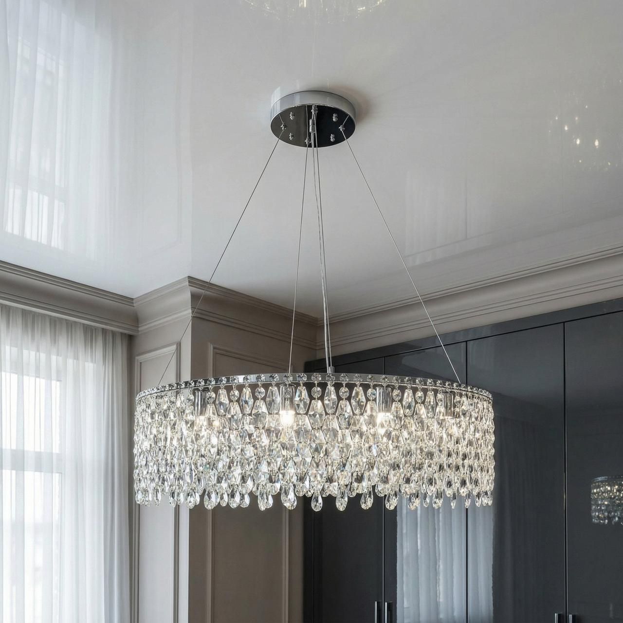 Величественная подвесная люстра, выполненная в стиле современный модерн. Модель представляет собой массивную цилиндрическую конструкцию из зеркального хромированного металла, украшенную многоярусным каскадом из прозрачных хрустальных подвесок. Благодаря наличию двенадцати источников света и значительному диаметру (78 см), этот светильник станет доминирующим элементом интерьера просторной гостиной, зала или торжественной столовой.