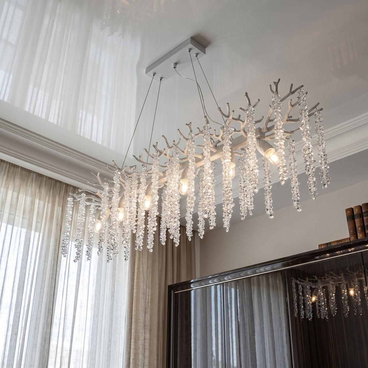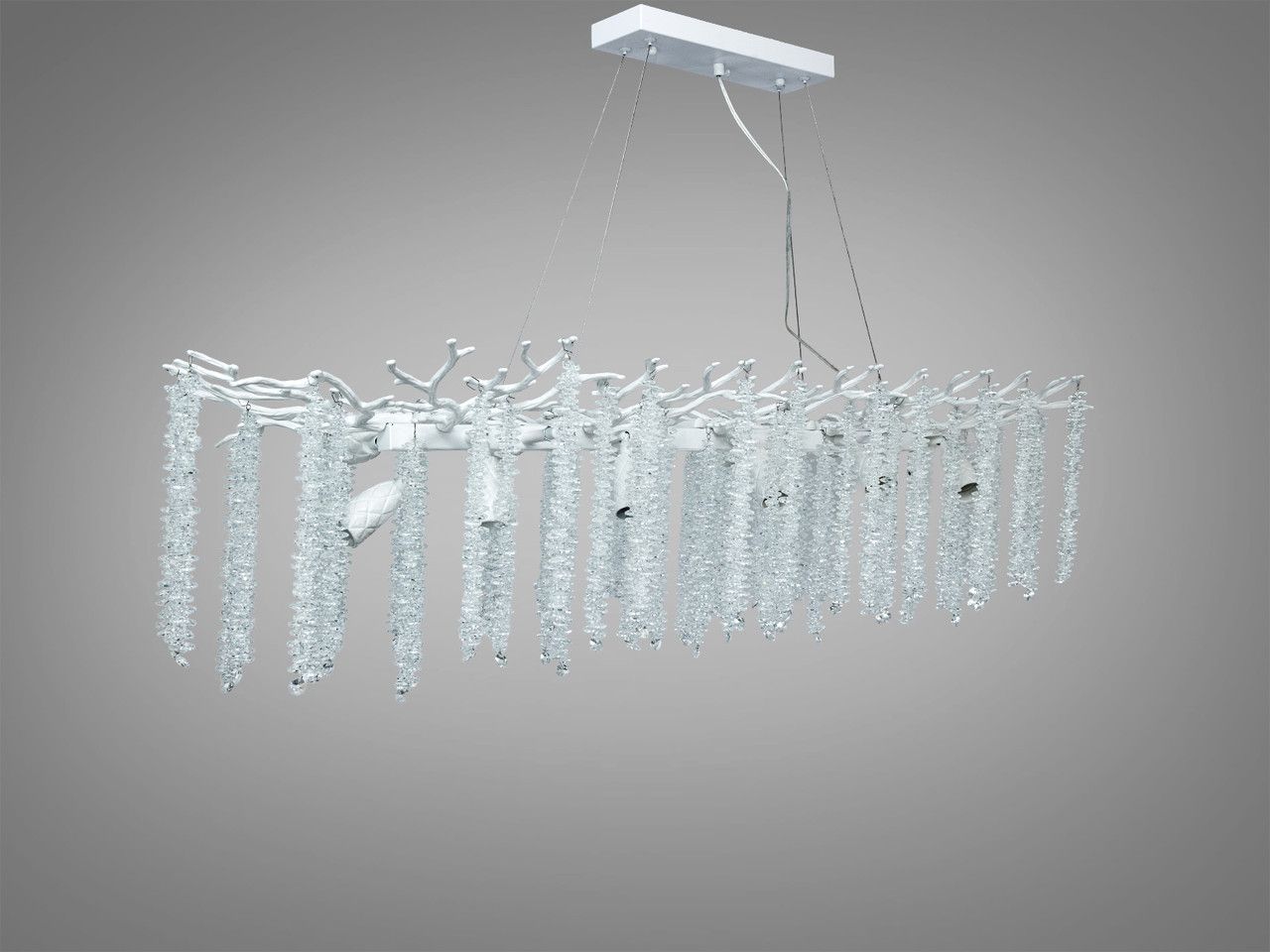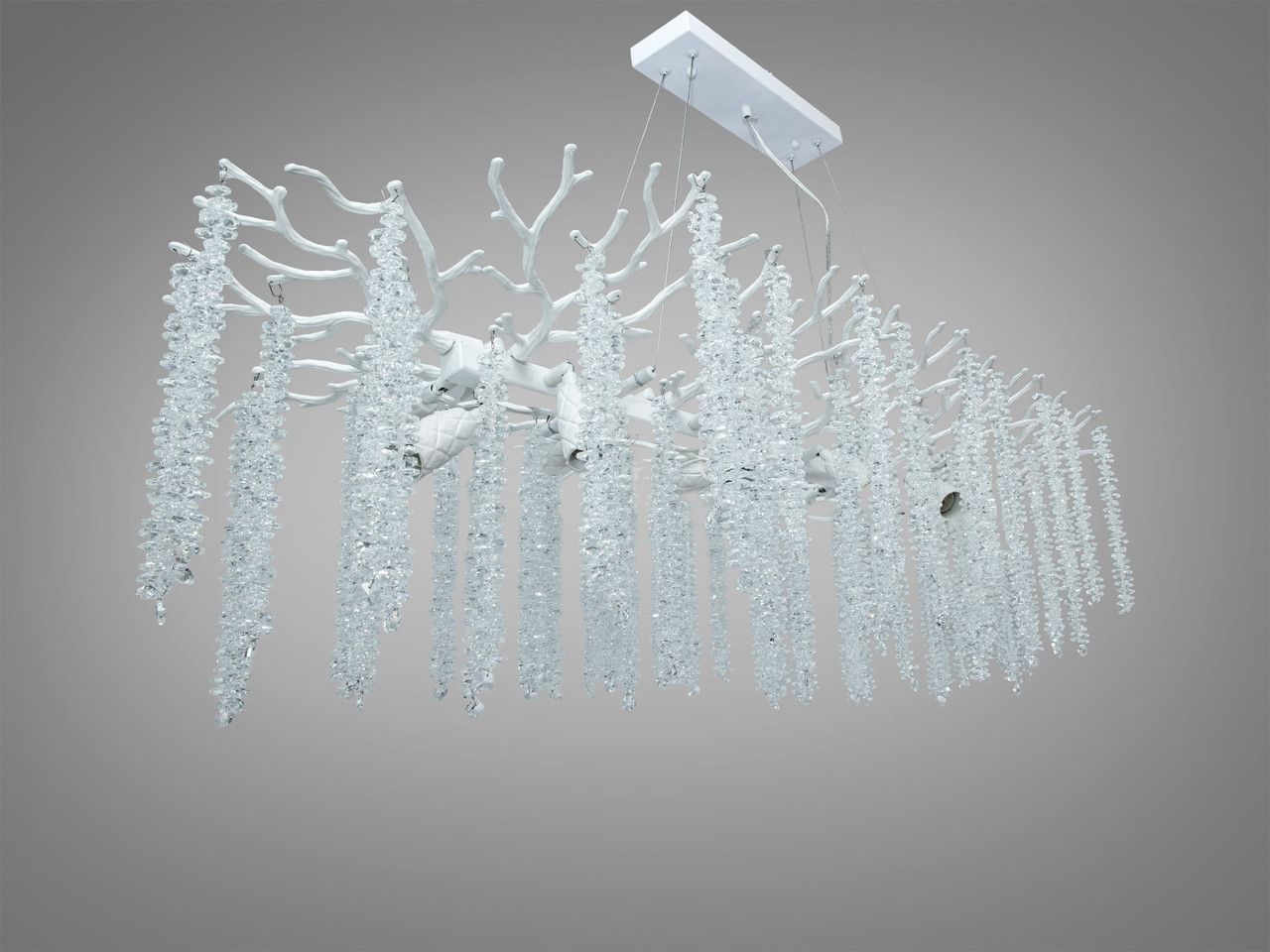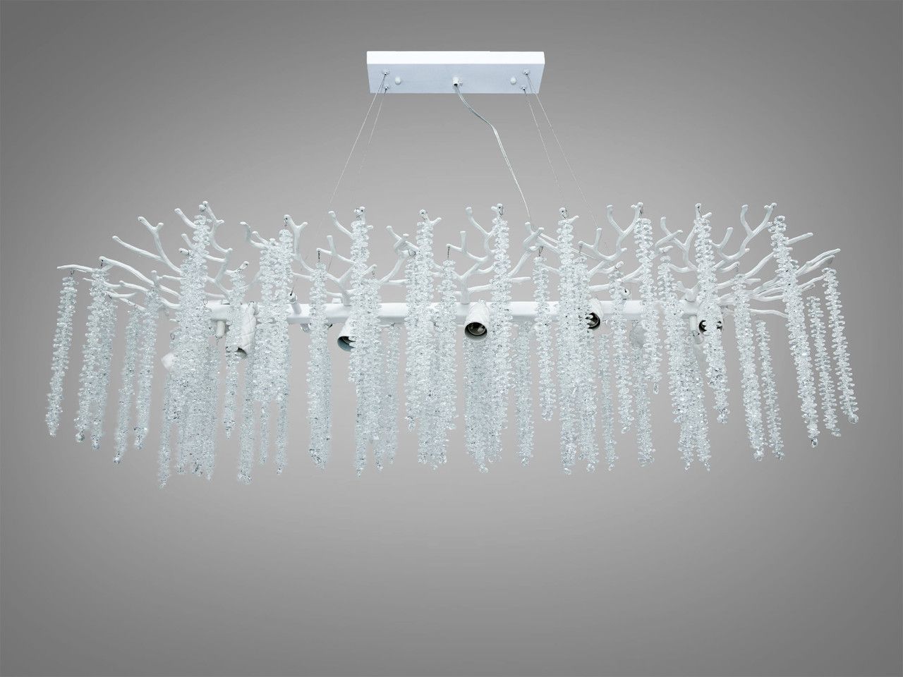 Величественная подвесная люстра линейной формы, представляющая собой роскошную световую инсталляцию в стиле флористика. Дизайн модели вдохновлен ниспадающими ветвями цветущей глицинии: массивный металлический каркас белого цвета густо украшен каскадом из прозрачных хрустальных нитей. Благодаря внушительной длине 122 см и двенадцати источникам света, эта люстра станет доминирующим элементом интерьера в просторных залах, гостиных или над большими обеденными зонами.