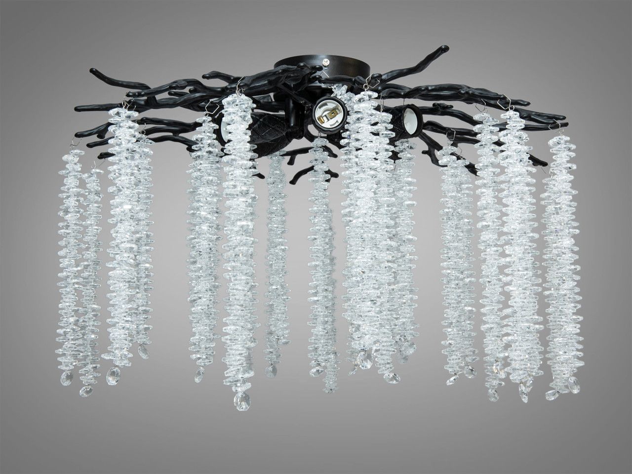 Эксклюзивная потолочная люстра, выполненная в стиле флористика и современный модерн. Модель представляет собой художественную композицию из черных матовых ветвей, с которых ниспадают густые нити прозрачного хрусталя, имитирующие застывшие капли дождя. Благодаря пяти источникам света и компактной высоте (32 см), этот светильник станет эффектным акцентом в помещениях со стандартными потолками, добавляя интерьеру графичности и утонченной роскоши.