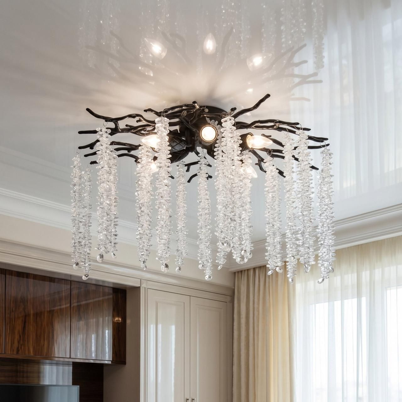 Уникальный художественный дизайн: форма, имитирующая природные мотивы (ветви и капли), выделяет эту модель на фоне стандартных геометрических люстр.
