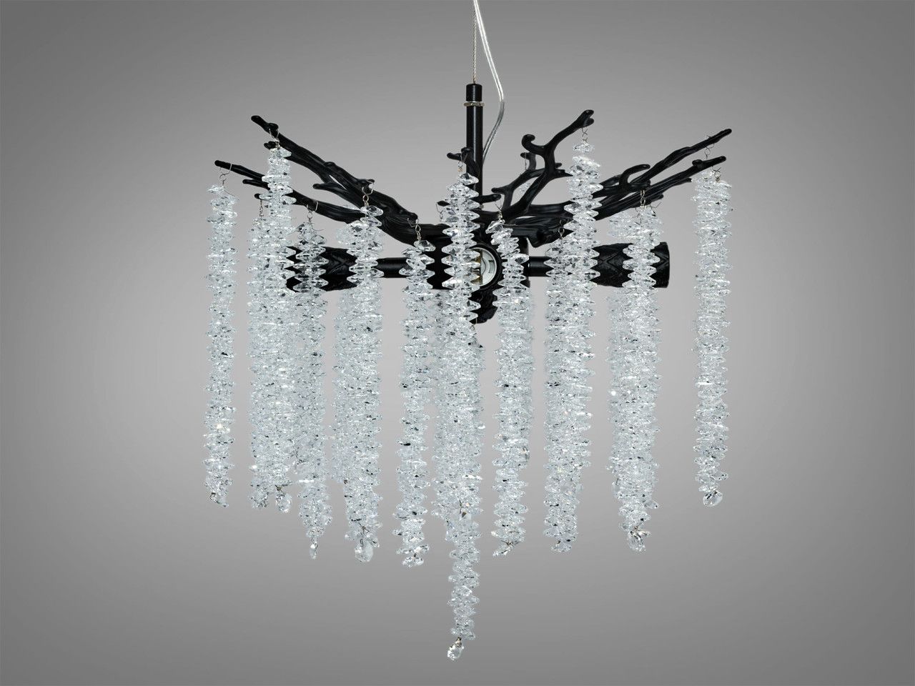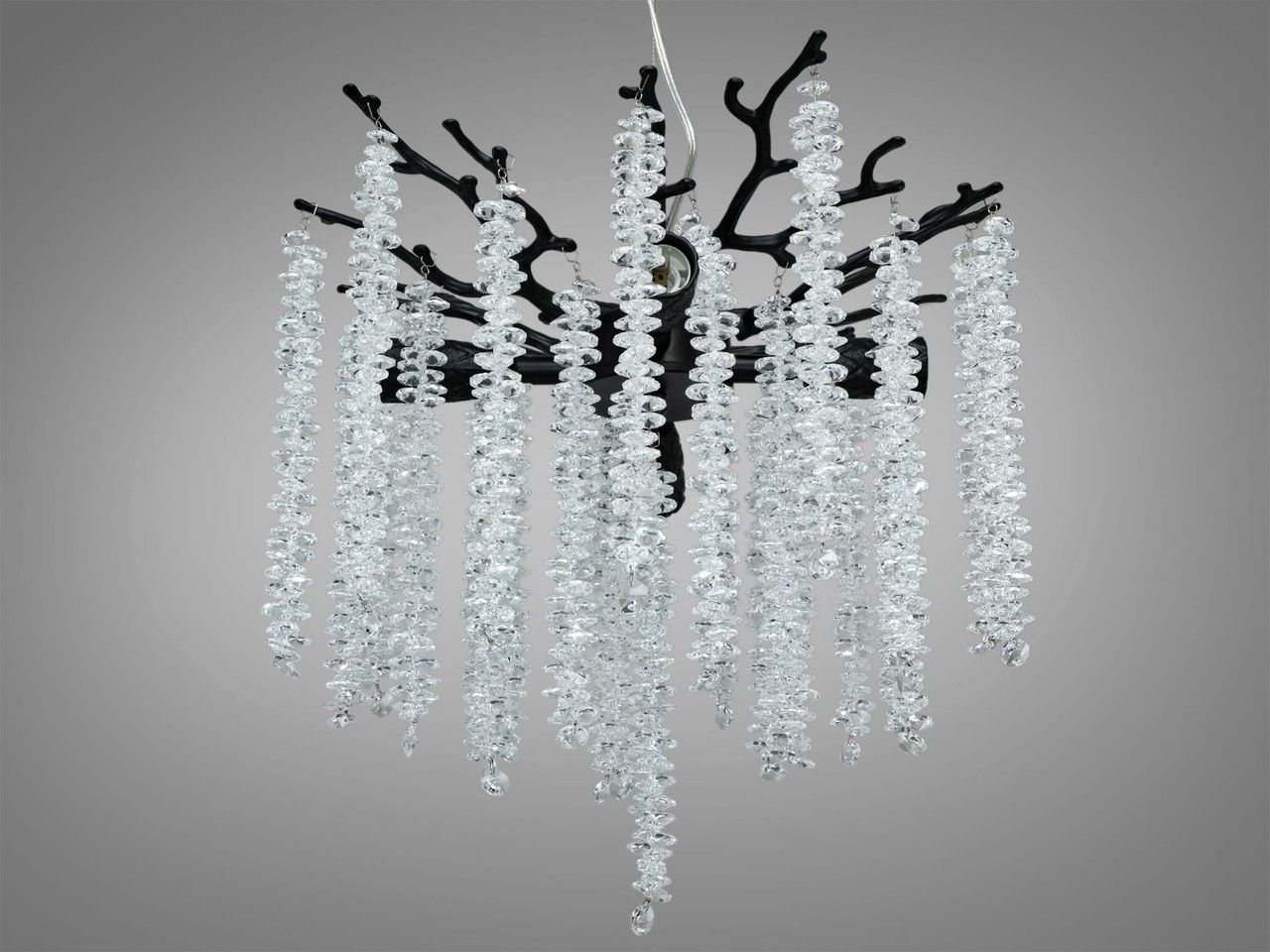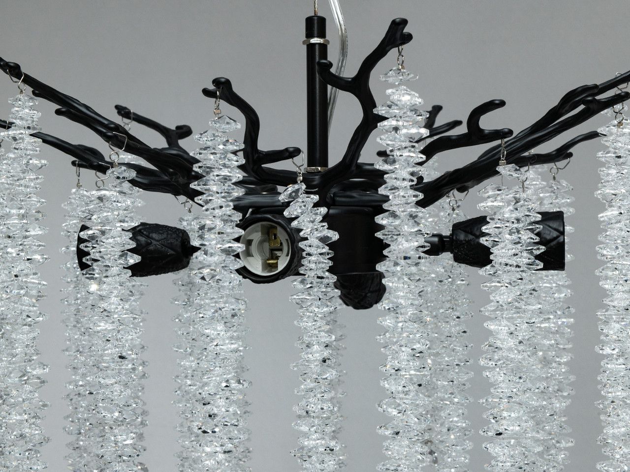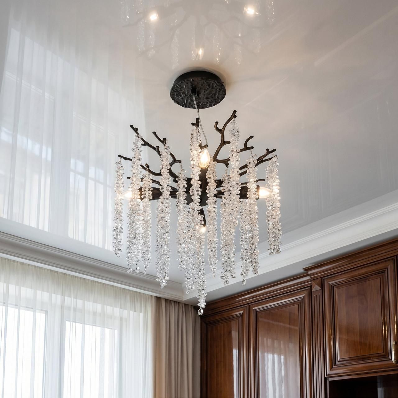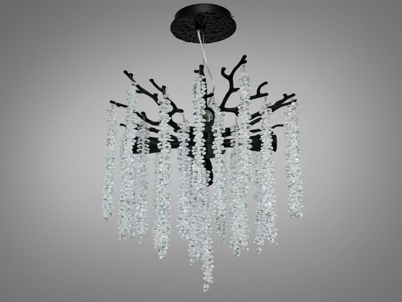 Элегантная подвесная люстра, выполненная в стиле флористики и современного модерна. Дизайн модели вдохновлен природными формами: черный матовый металлический каркас напоминает ветви дерева, с которых ниспадают нити прозрачного хрусталя, имитирующие застывшие капли воды. Благодаря компактному диаметру 38 см и четырем источникам света, этот светильник станет изысканным акцентом в интерьере спальни, кухни или уютной зоны отдыха.
