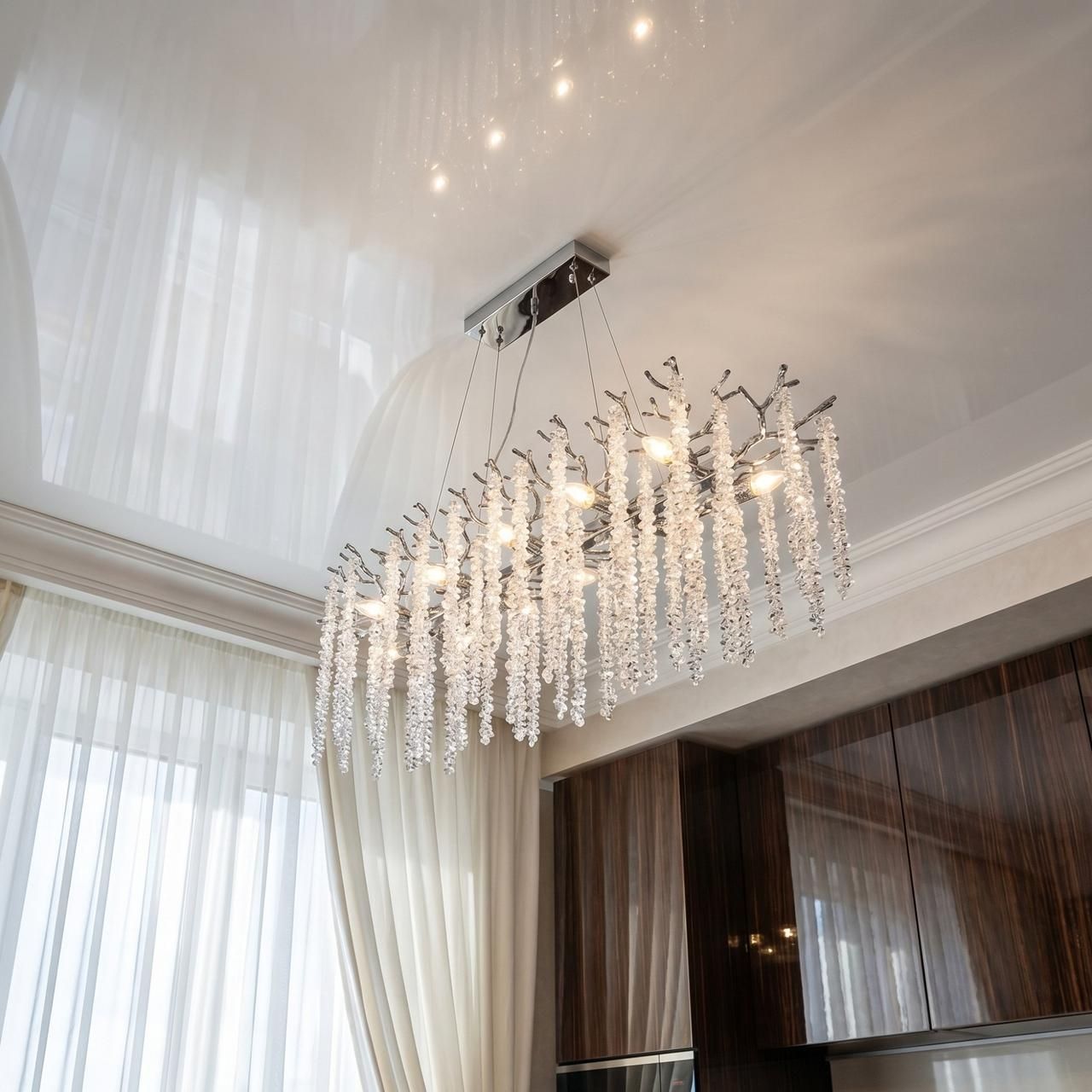 Линейная форма люстры длиной 122 см идеально подходит для размещения над столами на 10-14 персон. Обилие хрусталя создает торжественную атмосферу, мягко преломляя свет и наполняя зону трапезы множеством искристых бликов. Зеркальный хром гармонирует с современной посудой и бытовой техникой.