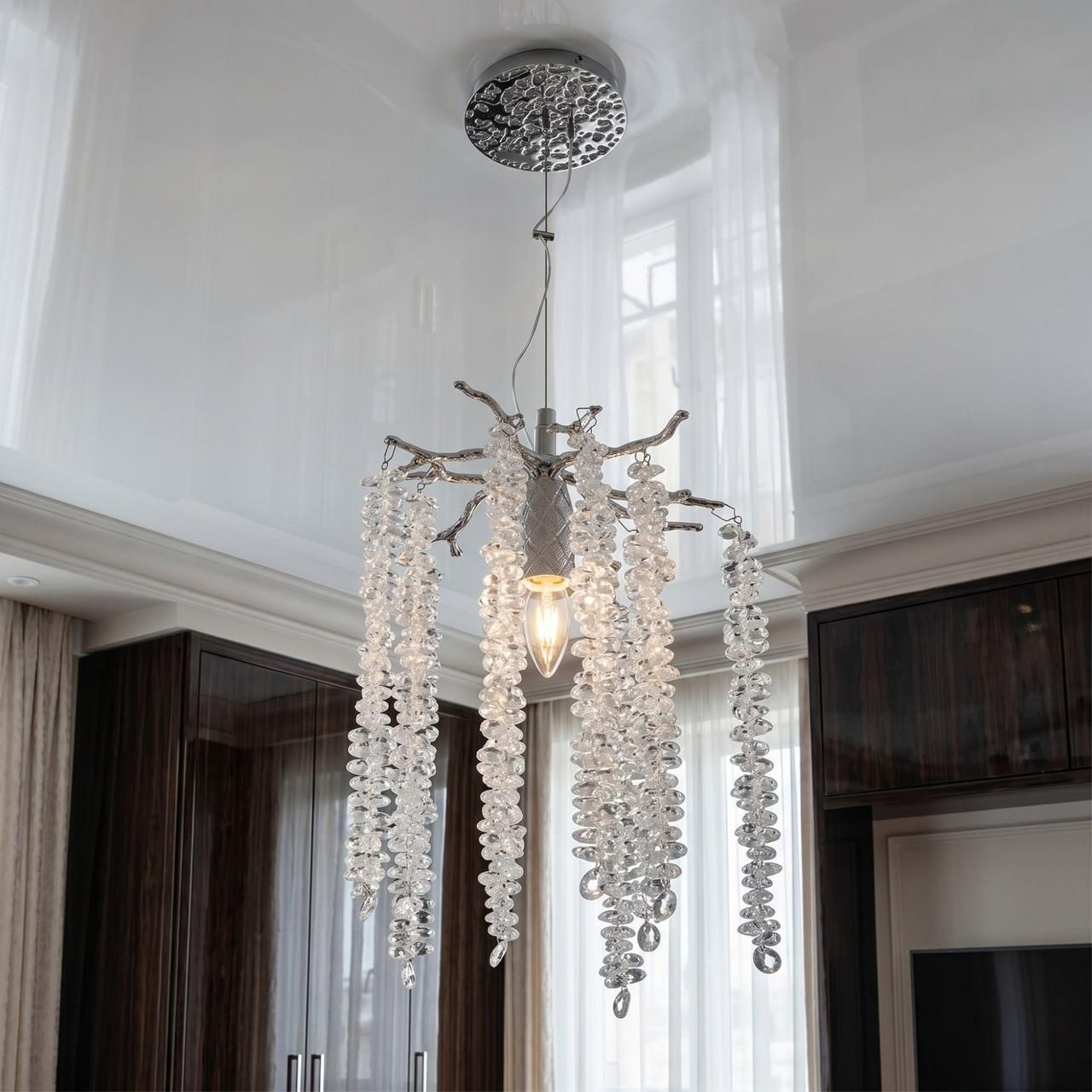 Уникальный силуэт: необычная форма в виде ветви с кристаллами выделяет светильник на фоне стандартных геометрических моделей.