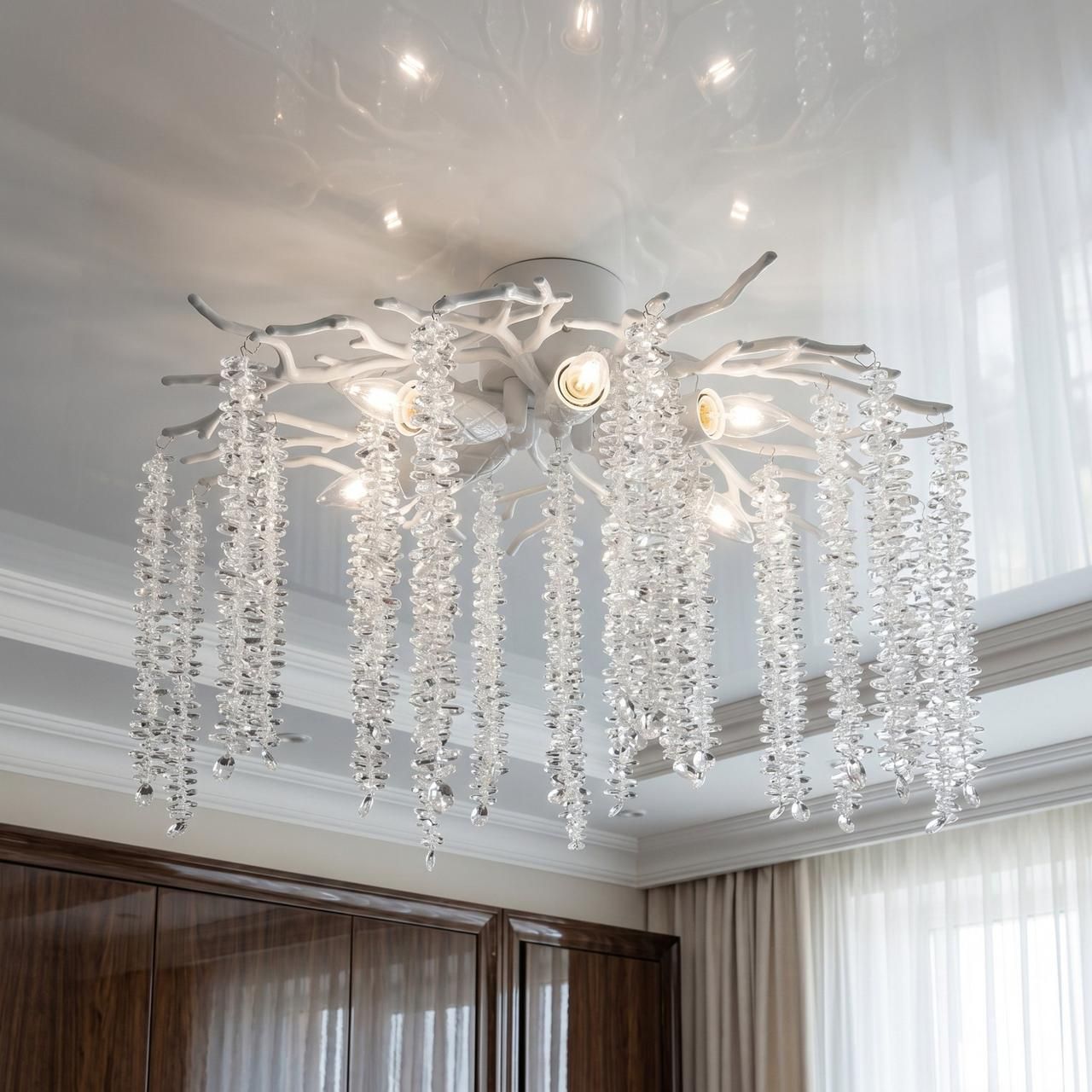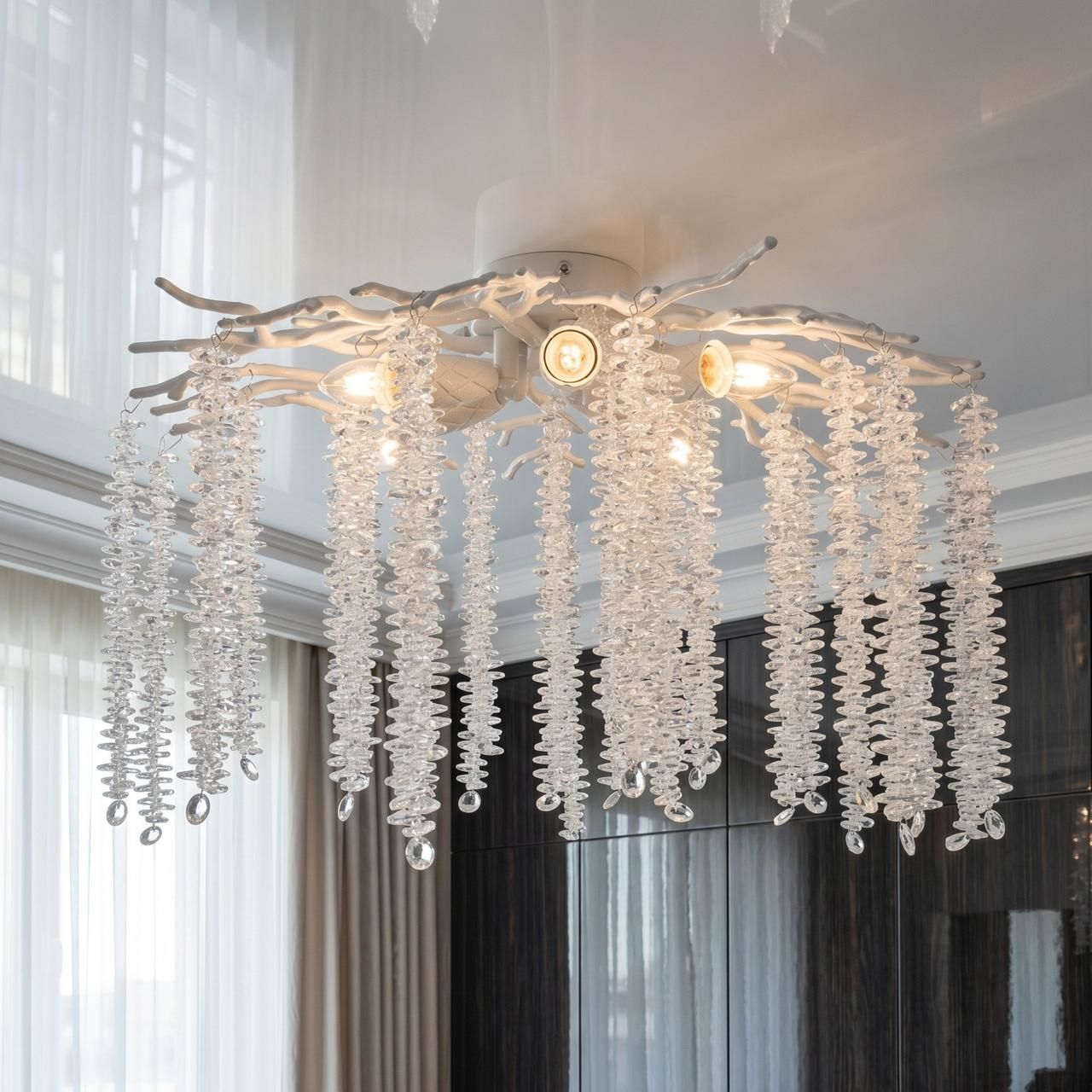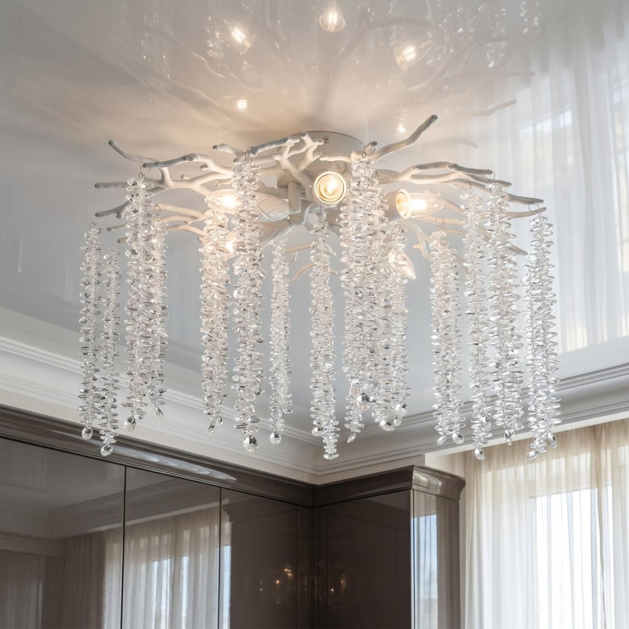 Необычная форма в виде цветущих ветвей превращает осветительный прибор в самостоятельный арт-объект. Хрустальные подвески преломляют лучи, наполняя комнату множеством бликов. Модель отлично впишется в интерьеры в стиле прованс, неоклассика или современный минимализм.