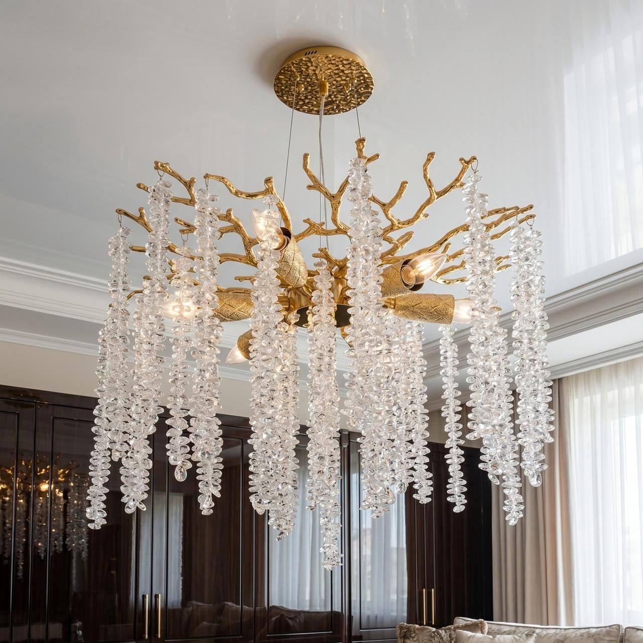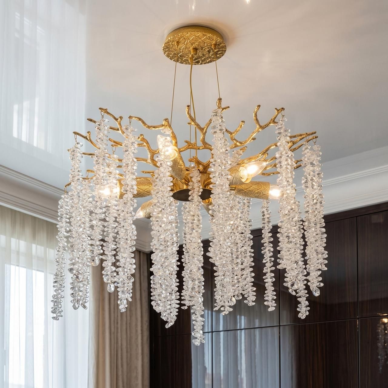 Форма люстры, имитирующая природные мотивы, способствует созданию уютной обстановки. При использовании светодиодных ламп с теплой цветовой температурой хрусталь наполняет комнату мягкими бликами, создавая оптимальные условия для отдыха.
