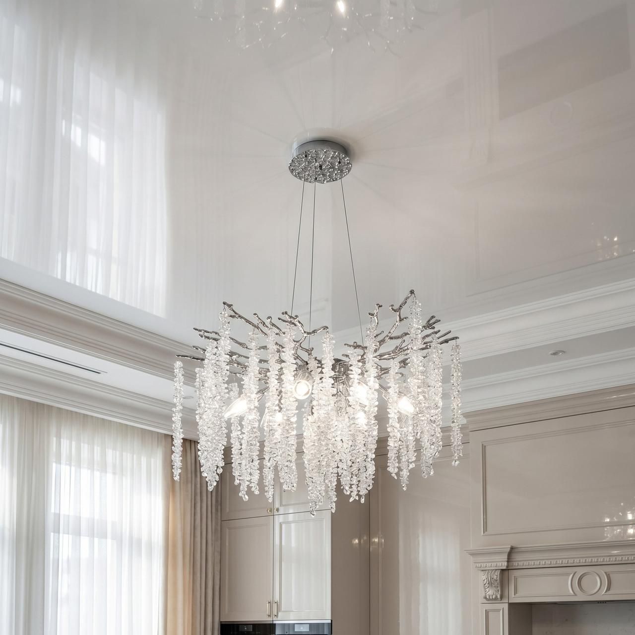 Дизайнерская подвесная люстра в стиле флористика, выполненная в цвете зеркальный хром. Конструкция имитирует переплетение ветвей, украшенных каскадом из множества нитей прозрачного хрусталя. Благодаря восьми источникам света и регулируемой высоте, модель обеспечивает эффективное основное освещение и выступает в качестве центрального декоративного элемента в современных интерьерах.