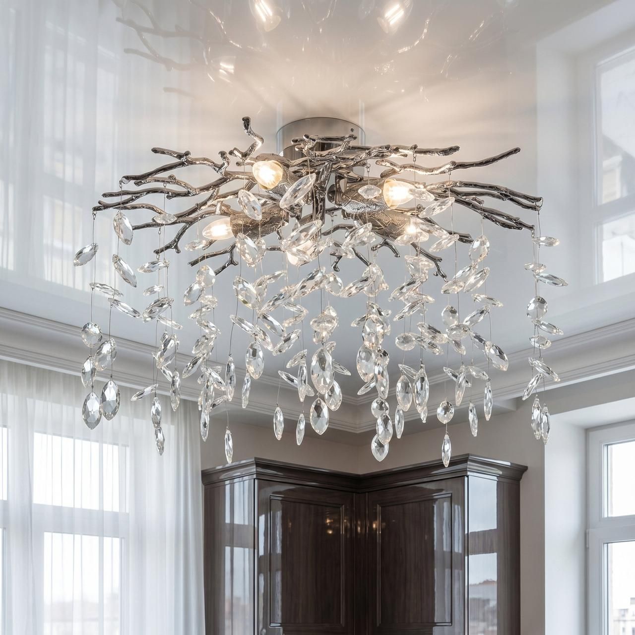Дизайн модели в виде ветвей с каплями превращает люстру в самостоятельный элемент декора. Светильник гармонично сочетается с интерьерами в стиле неоклассика, хай-тек или минимализм. Зеркальное покрытие корпуса отражает окружающее пространство, визуально облегчая конструкцию и добавляя помещению объема.