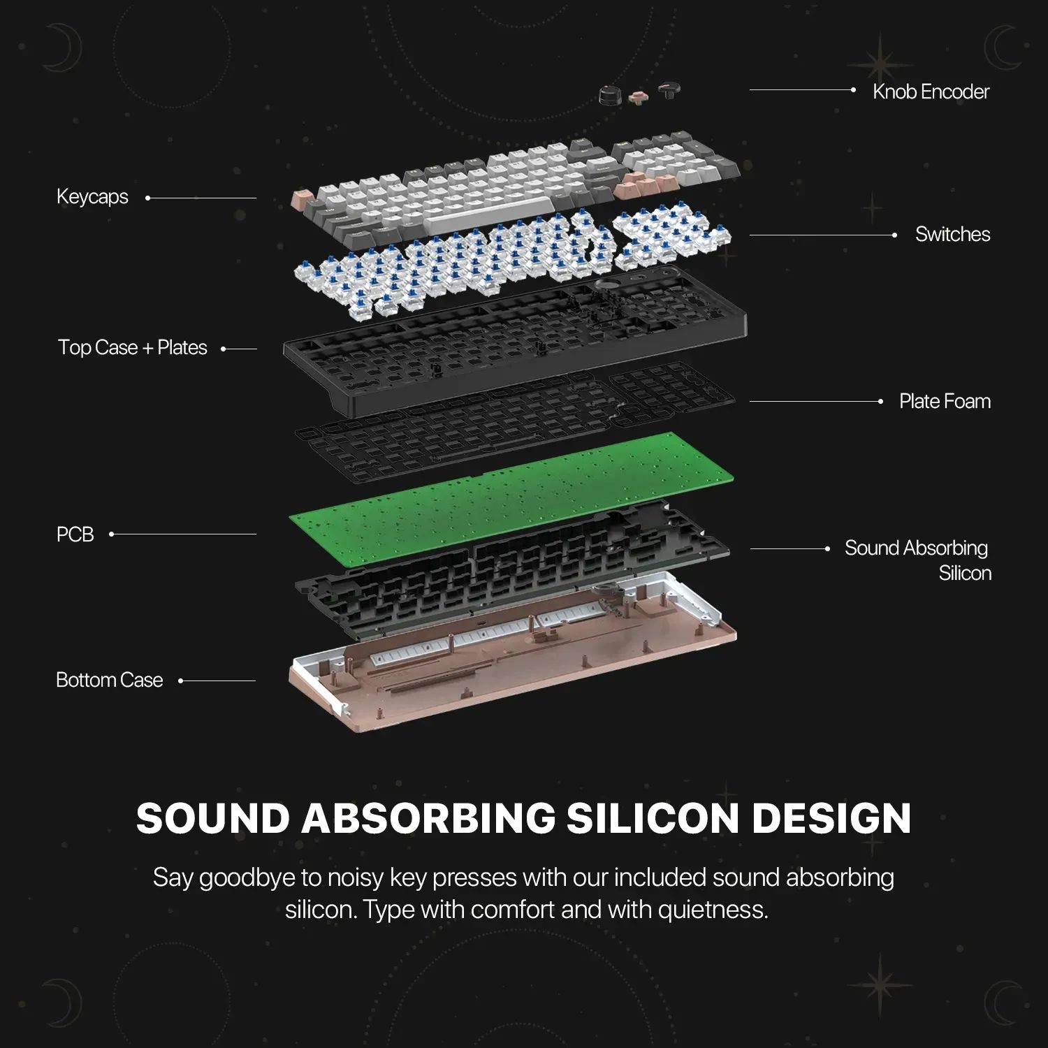- Внутренняя звукопоглощающая прокладка снижает резонанс и делает звук нажатий более мягким и комфортным.
