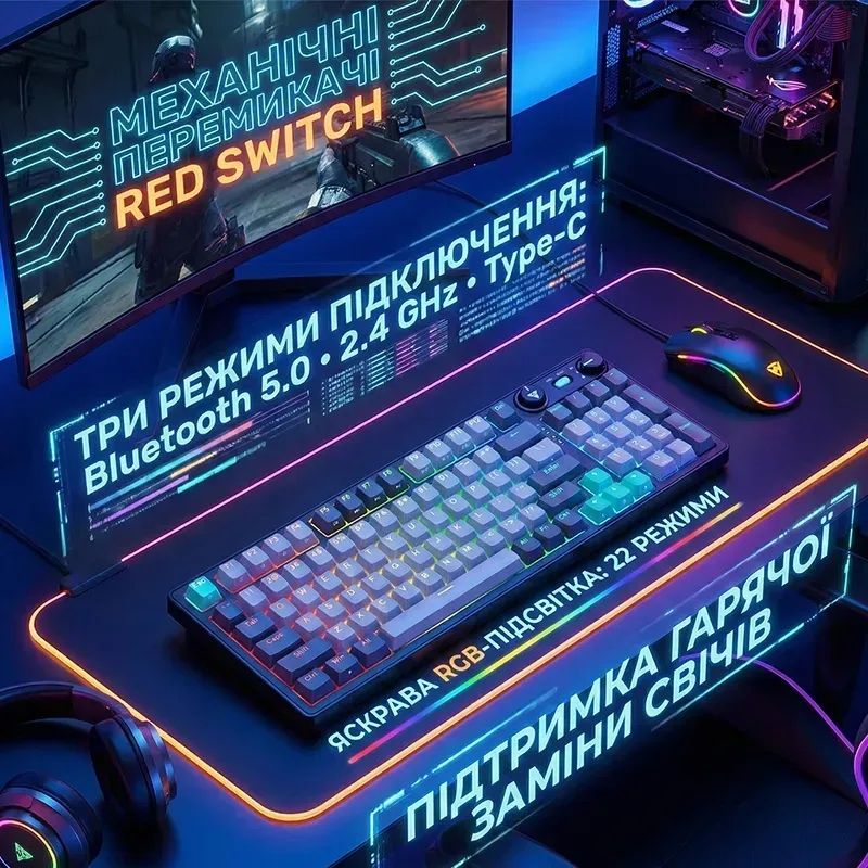 Эта клавиатура оснащена линейными переключателями Red Switch, поддерживает три режима подключения и отличается продуманной конструкцией с шумоизоляцией, что делает её универсальным решением как для игр, так и для работы.